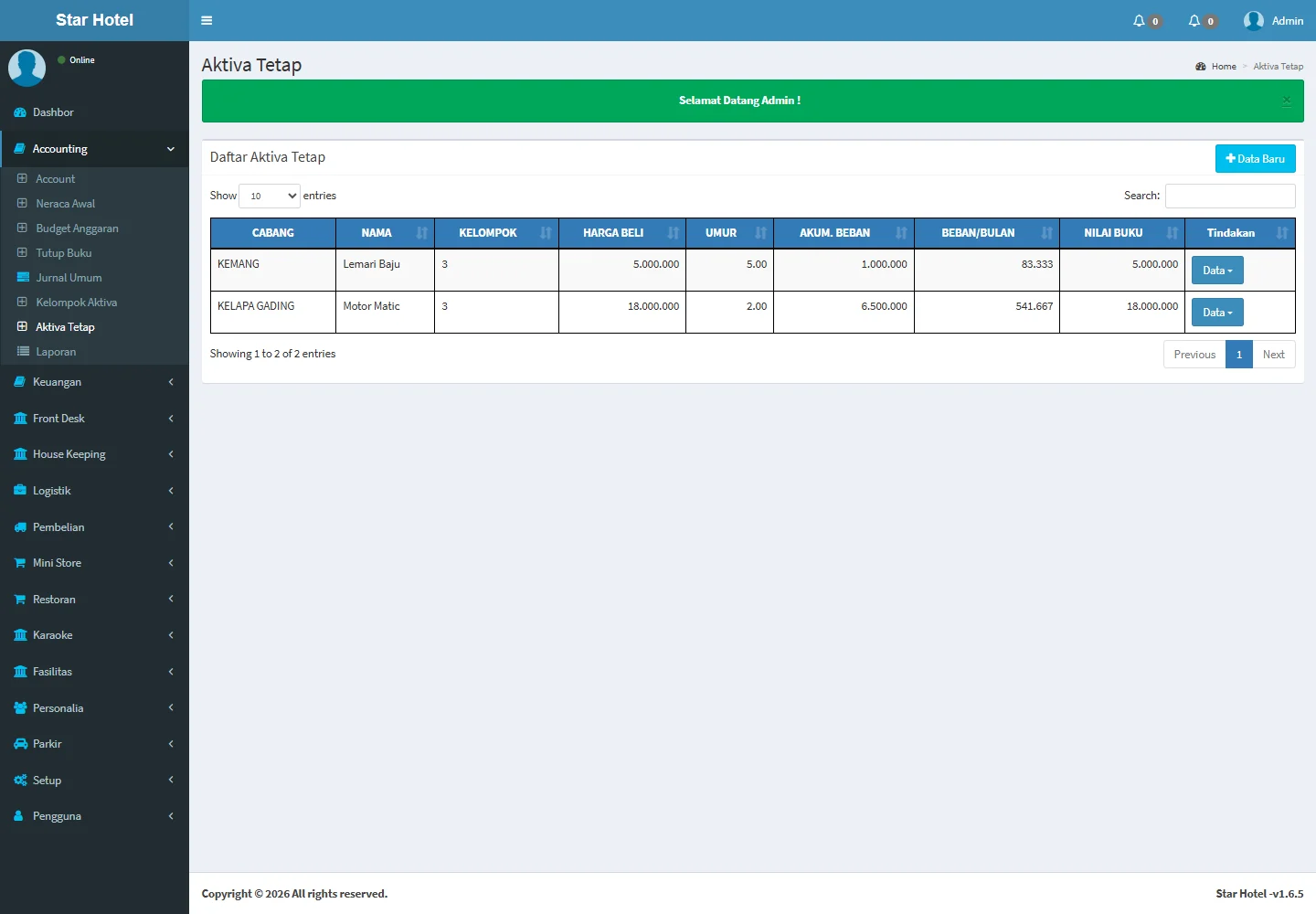 Manajemen aset tetap hotel: gedung, furnitur, peralatan. Hitung depresiasi otomatis dan pantau nilai buku setiap aset.