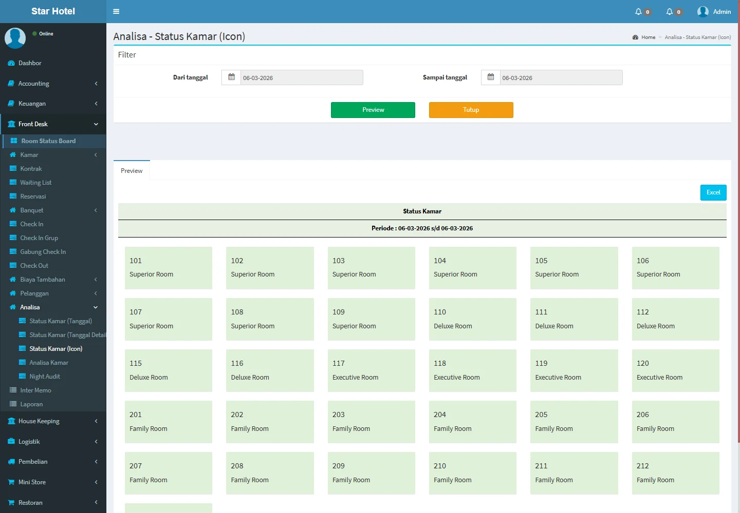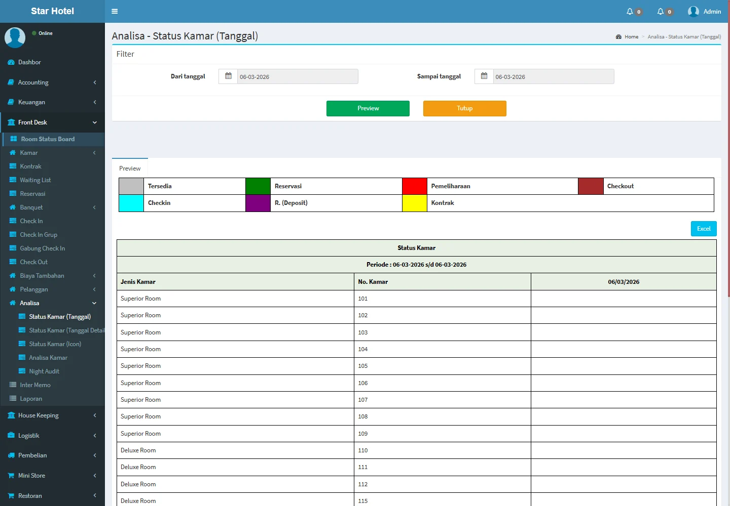 Lihat status semua kamar dalam rentang tanggal yang dipilih — Tersedia, Reservasi, Checkin, Checkout, Pemeliharaan, dan lainnya dalam satu tampilan.