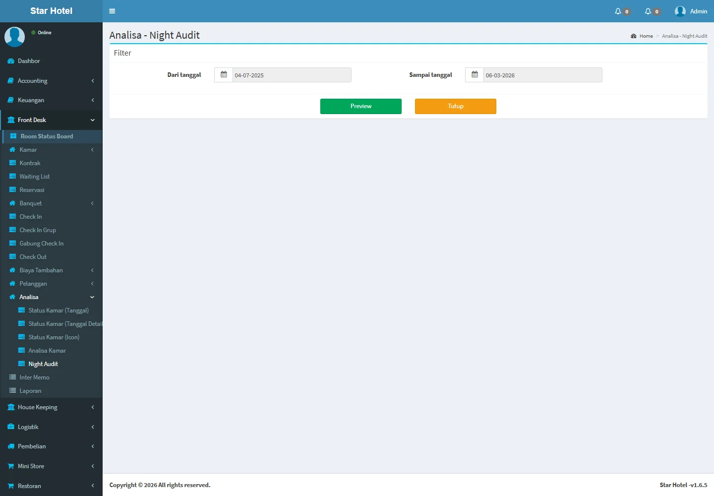 Penutupan harian otomatis — mengunci transaksi, update status kamar, dan laporan hari ini siap untuk manajemen.