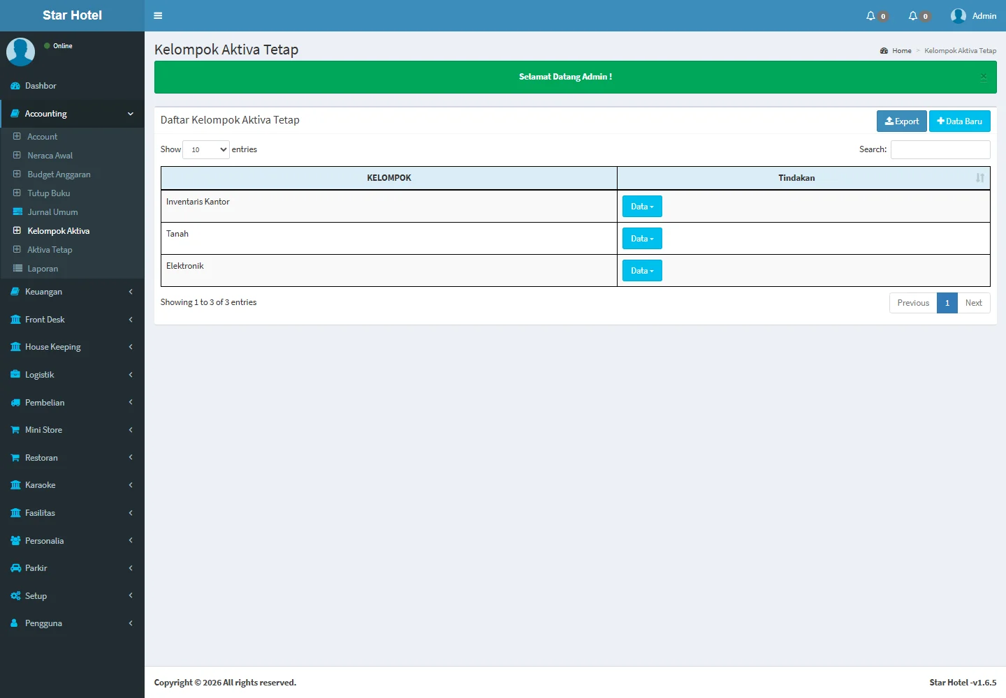 Kategorikan aktiva tetap hotel ke dalam kelompok yang terstruktur untuk perhitungan depresiasi yang akurat dan terorganisir.