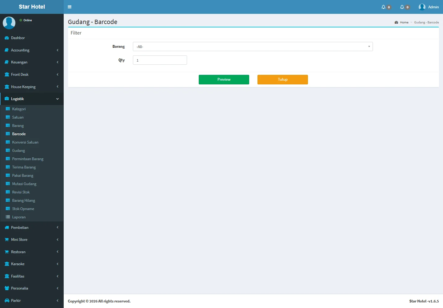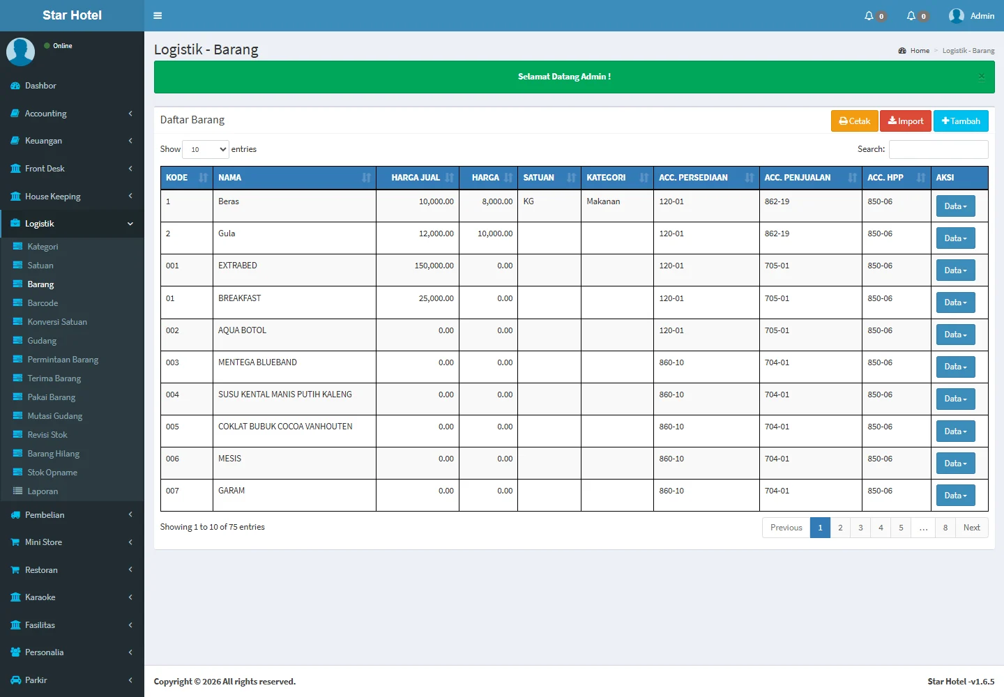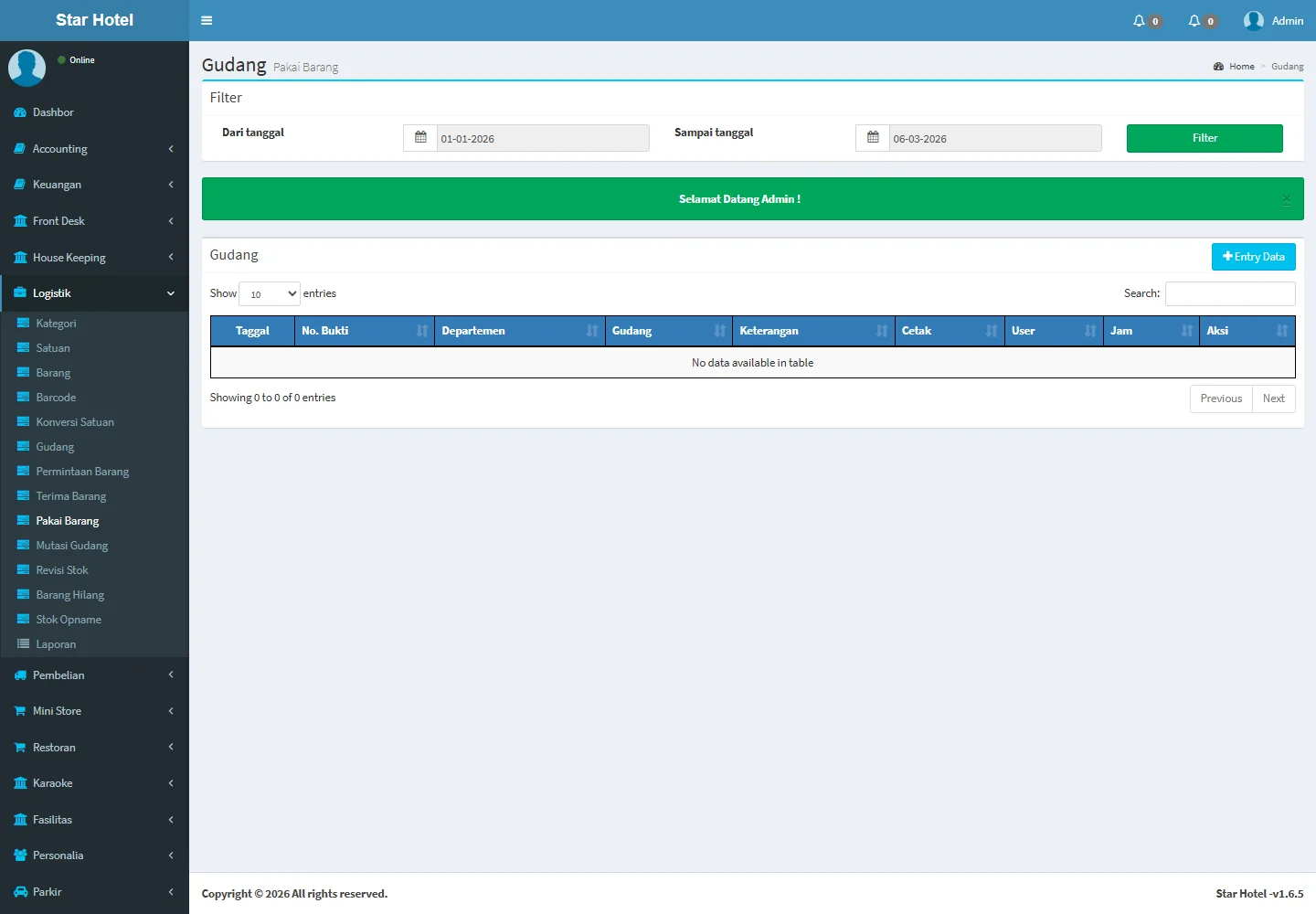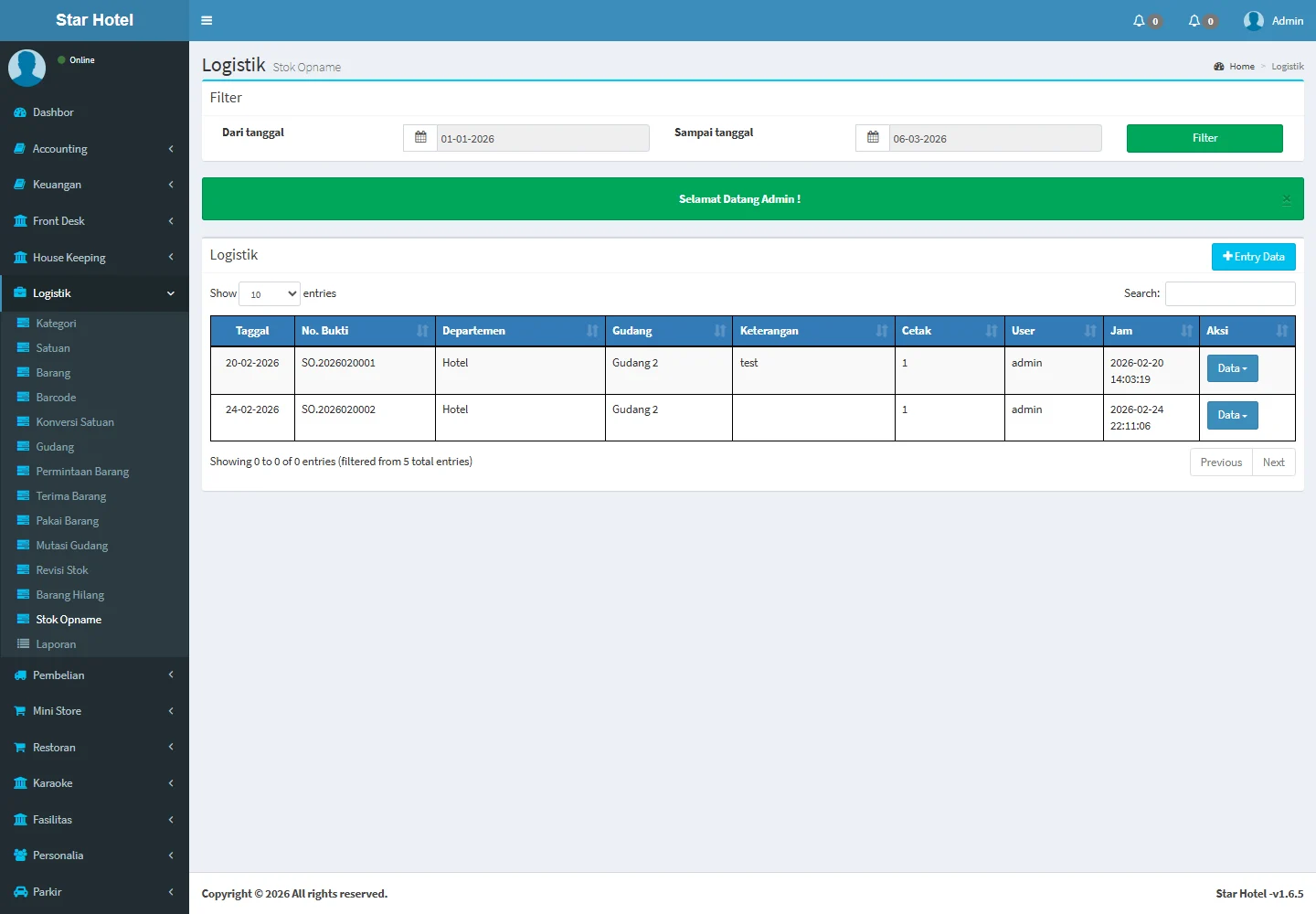 Manajemen inventori dan gudang yang lengkap. Pantau stok bahan dan perlengkapan hotel dari permintaan, penerimaan, penggunaan, hingga opname.