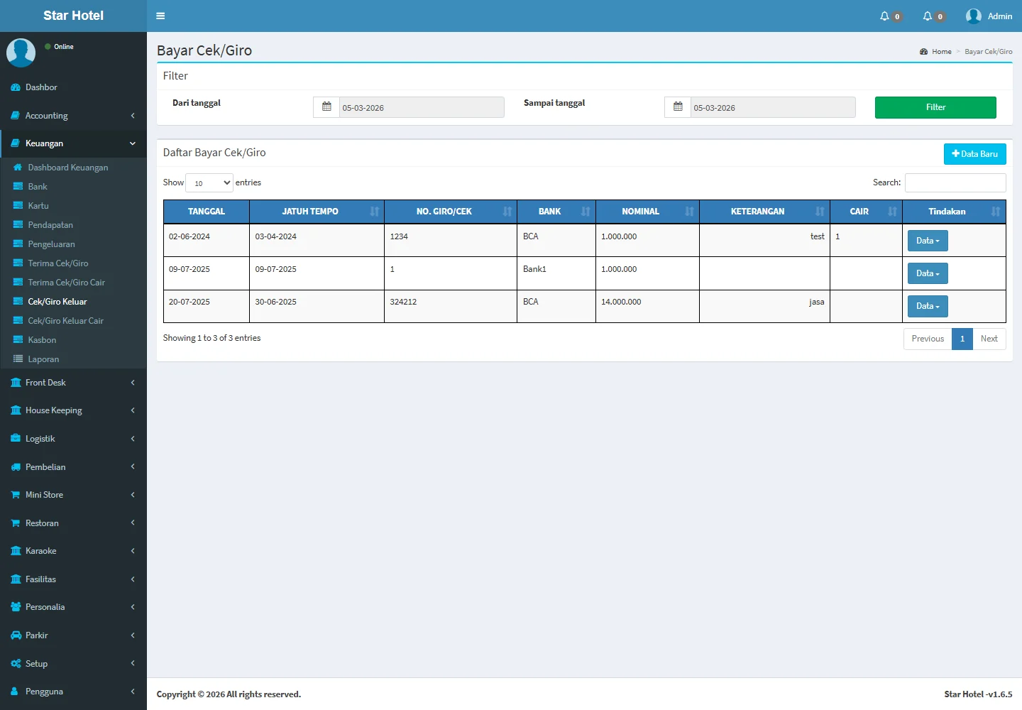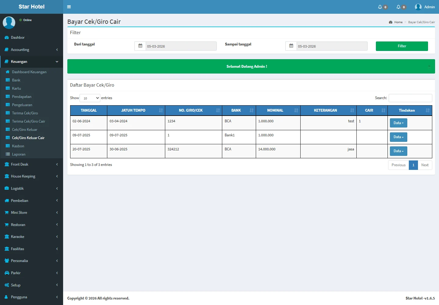 Catat penerimaan cek dan giro dari tamu atau mitra bisnis. Pantau status dan jatuh tempo pembayaran dengan mudah.