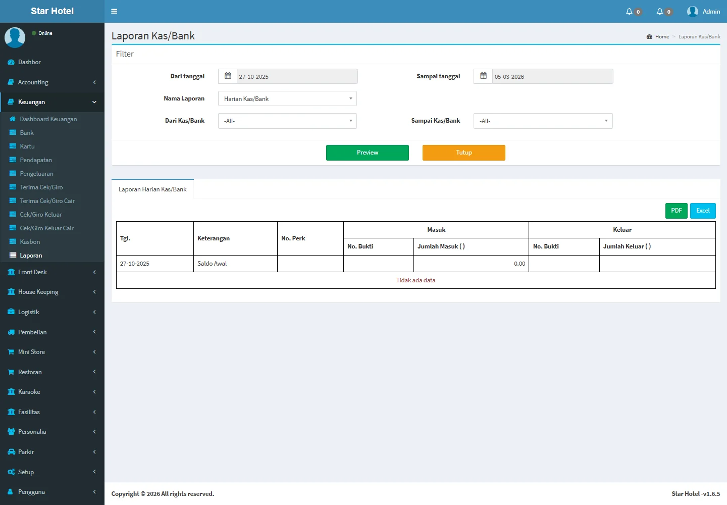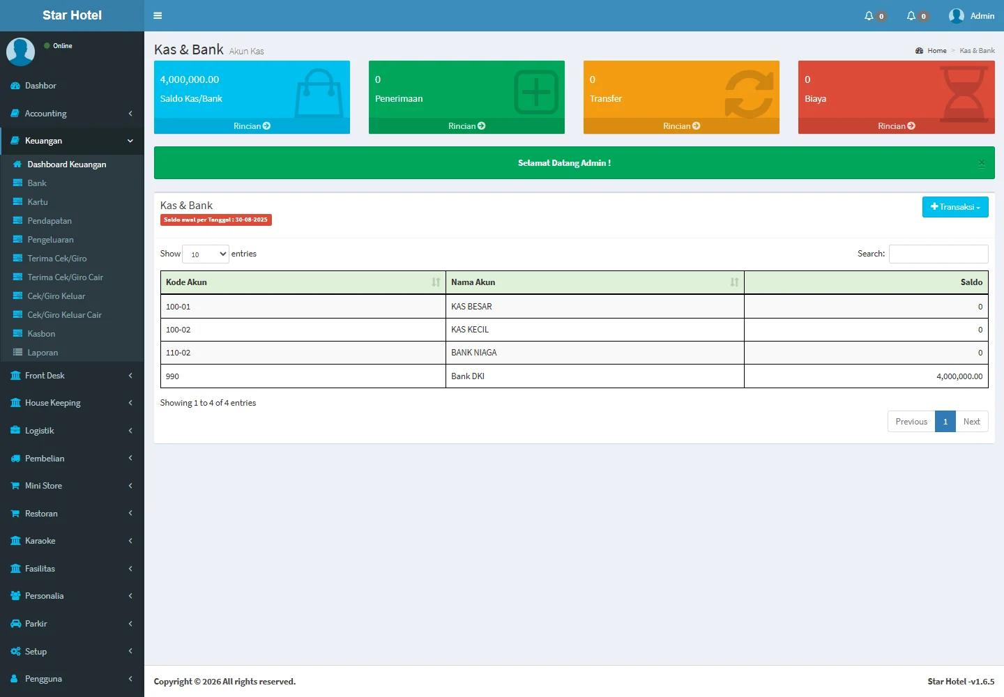 Kelola rekening bank hotel, catat transaksi masuk-keluar, dan rekonsiliasi otomatis dengan laporan mutasi bank bulanan.