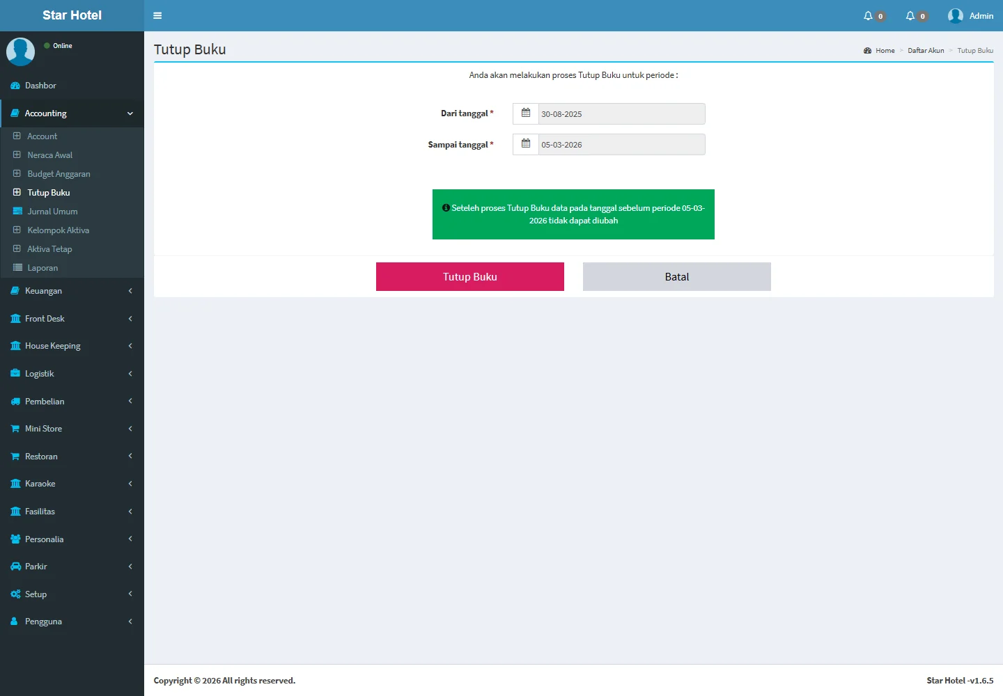 Proses penutupan periode akuntansi secara otomatis. Pastikan semua transaksi terkunci dan laporan periode tersimpan dengan aman.