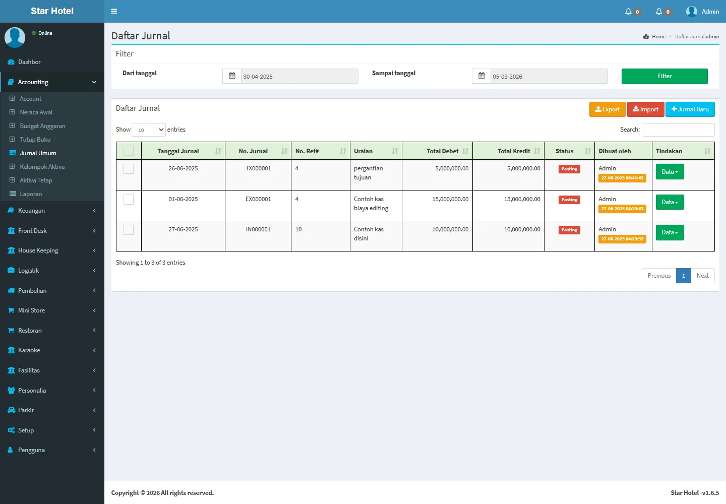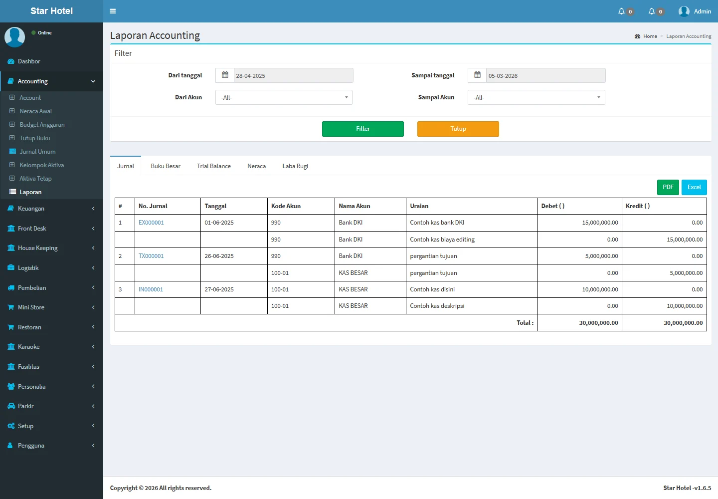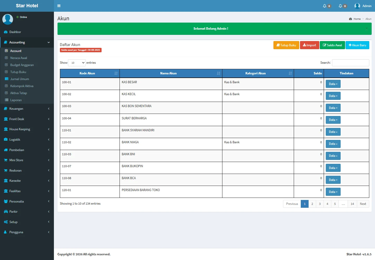 Kelola daftar akun keuangan hotel secara terstruktur. Buat, edit, dan kategorikan akun sesuai standar akuntansi hotel.