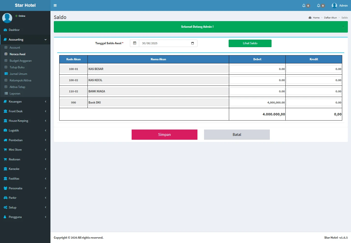 Input saldo awal neraca untuk periode akuntansi baru. Pastikan pembukuan dimulai dengan data yang akurat dan terverifikasi.