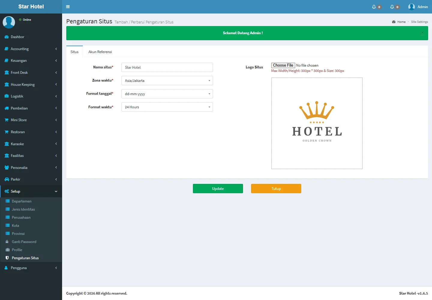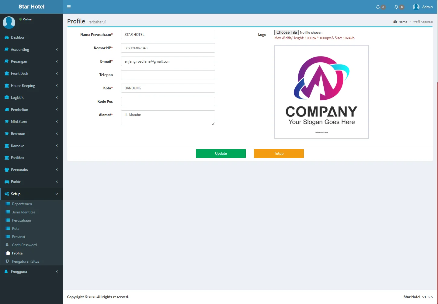 Konfigurasi dasar sistem sesuai profil dan kebutuhan hotel Anda. Atur data perusahaan, lokasi, keamanan akun, dan tampilan situs dalam satu panel admin.