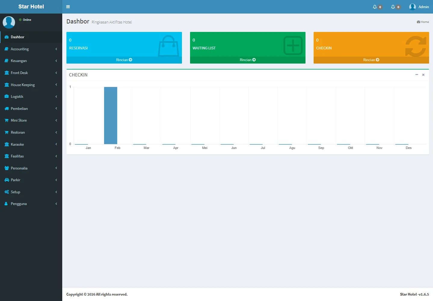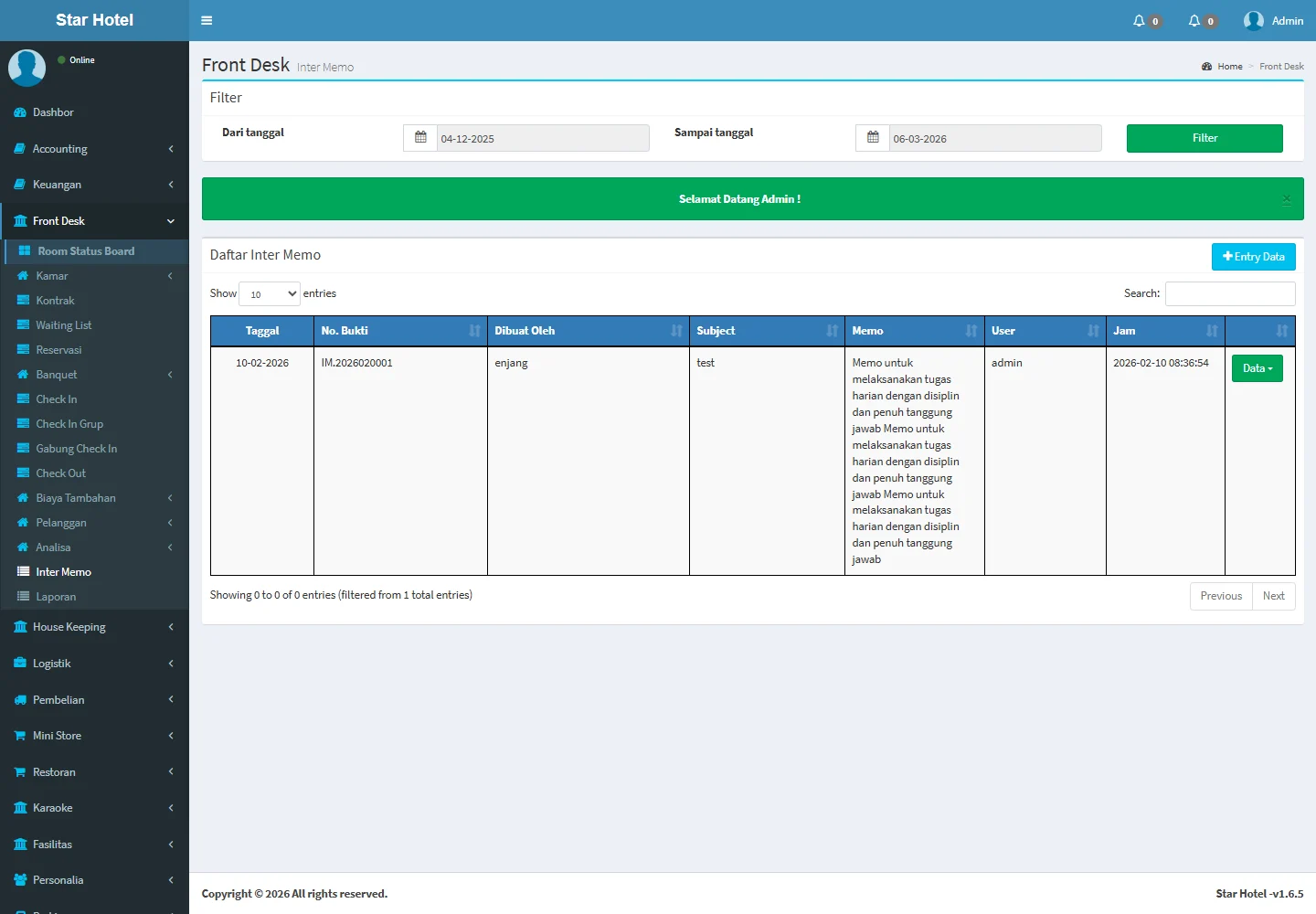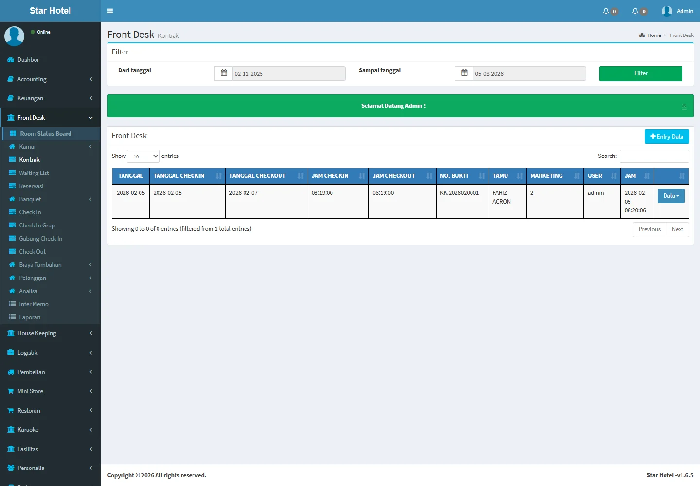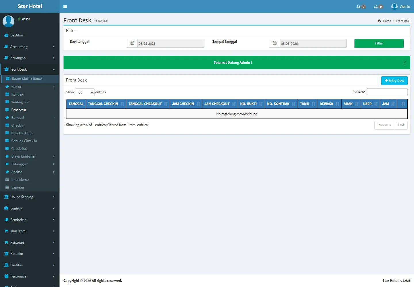 Starhotel dirancang untuk memudahkan pengelolaan hotel dalam satu platform terpadu. Tersedia lebih dari 15 modul penting, mulai dari Front Desk, Keuangan, Restoran, hingga Parkir. Semua terhubung dalam satu sistem yang rapi dan mudah digunakan.