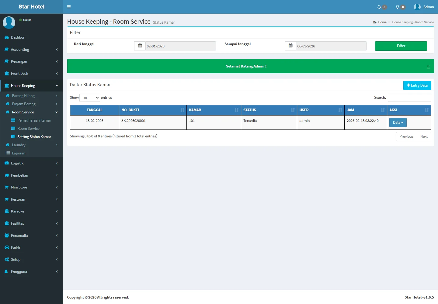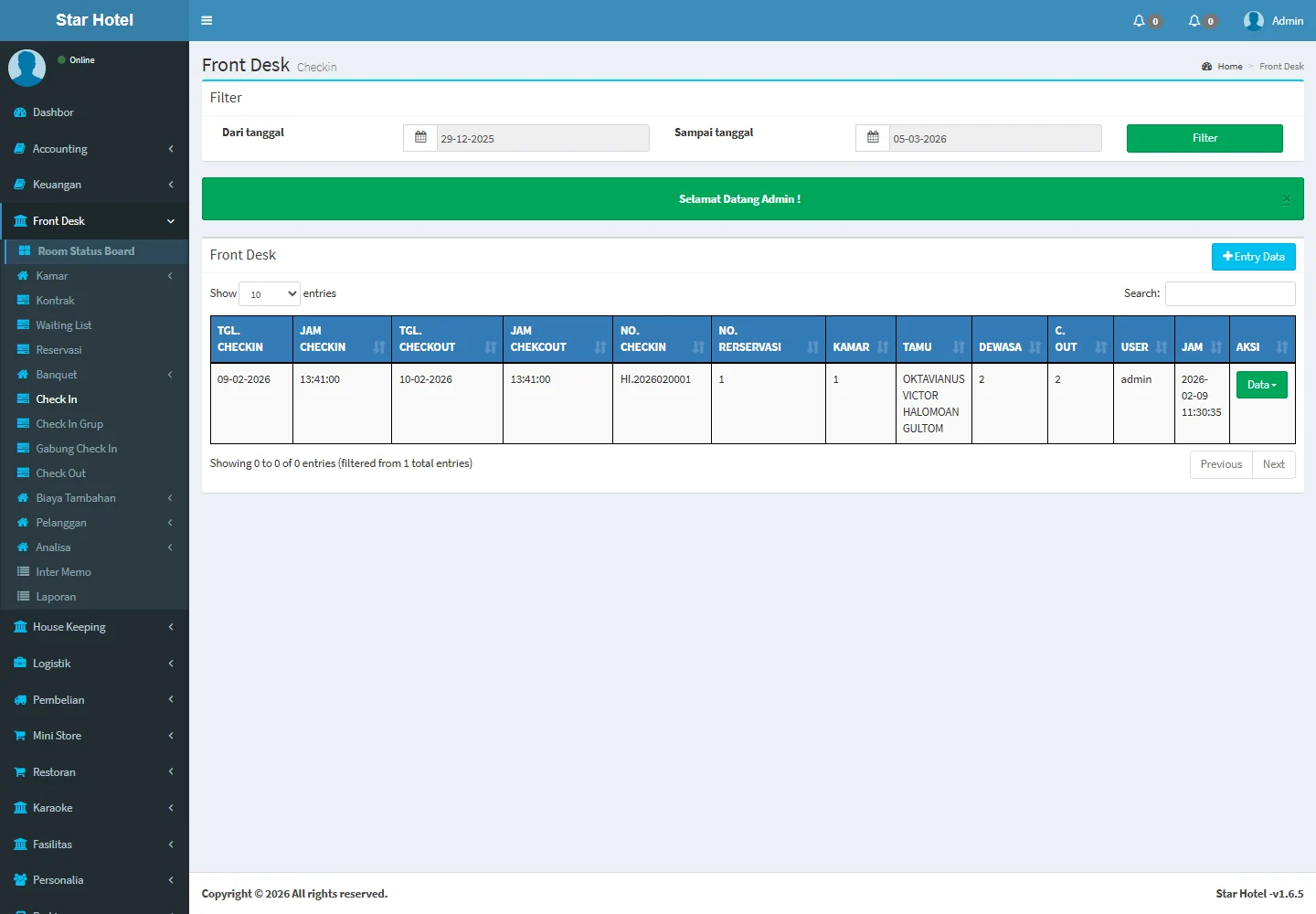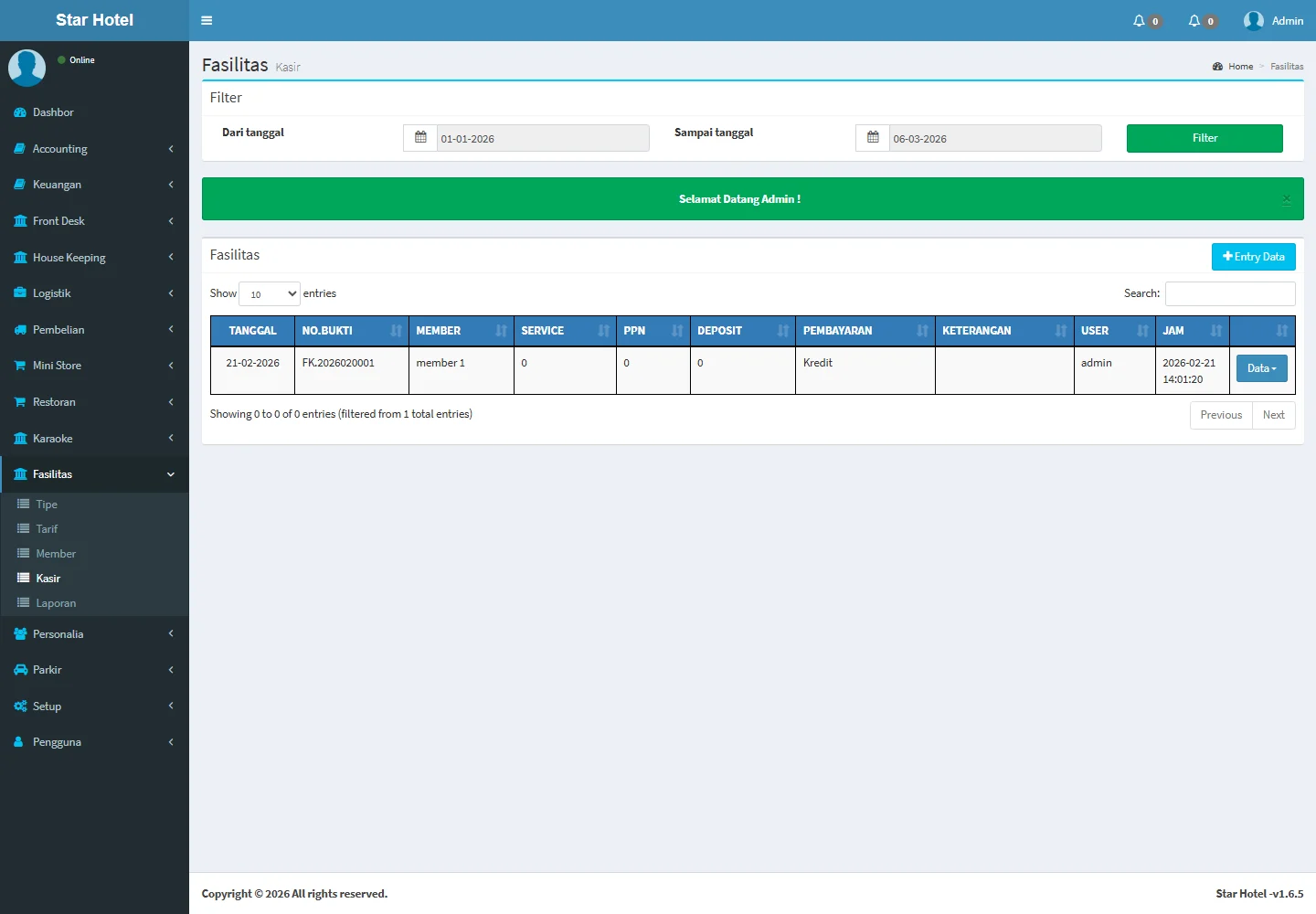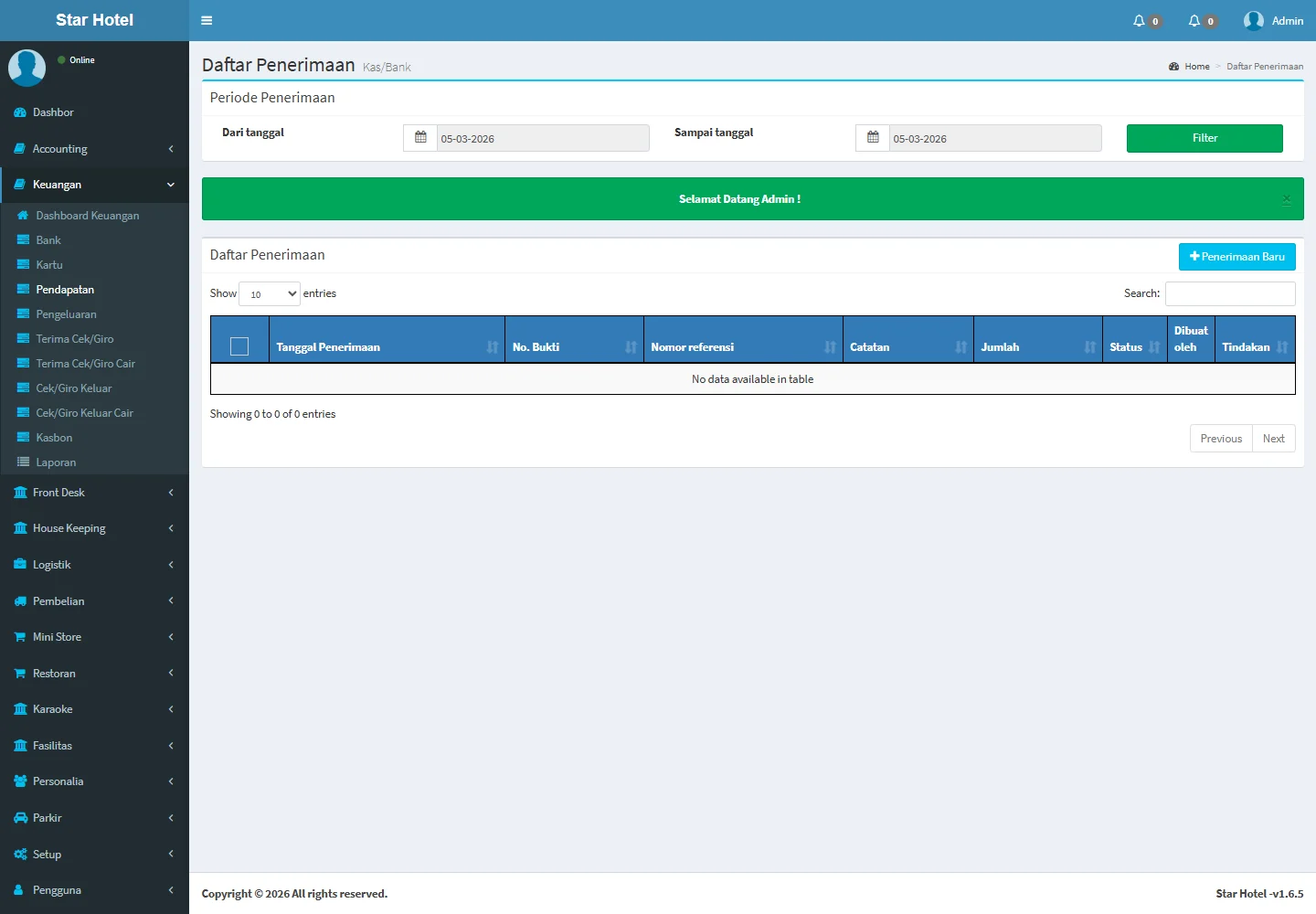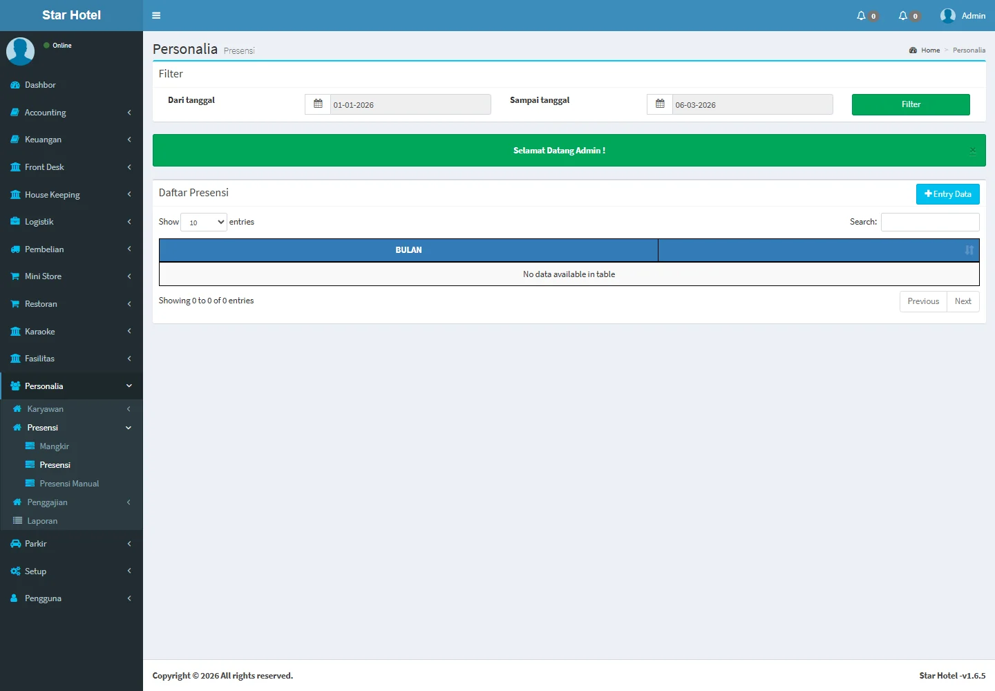 Starhotel dirancang untuk memudahkan pengelolaan hotel dalam satu platform terpadu. Tersedia lebih dari 15 modul penting, mulai dari Front Desk, Keuangan, Restoran, hingga Parkir. Semua terhubung dalam satu sistem yang rapi dan mudah digunakan.