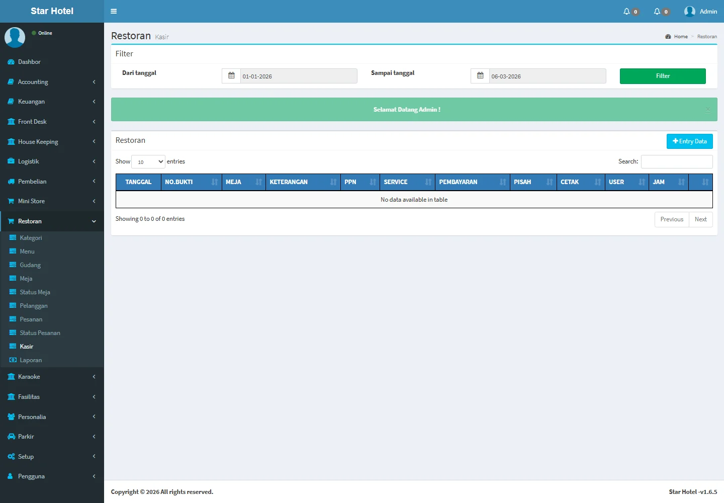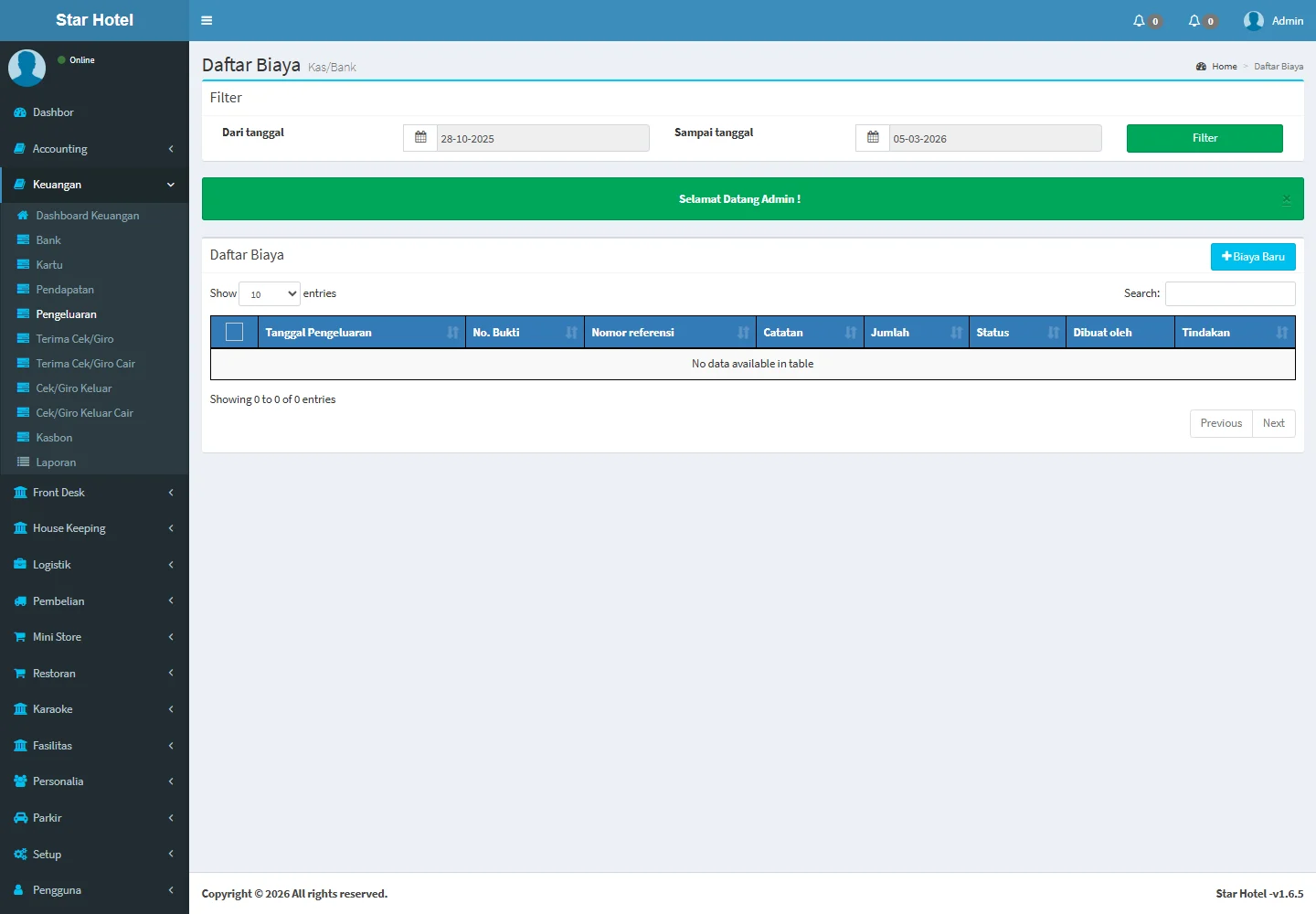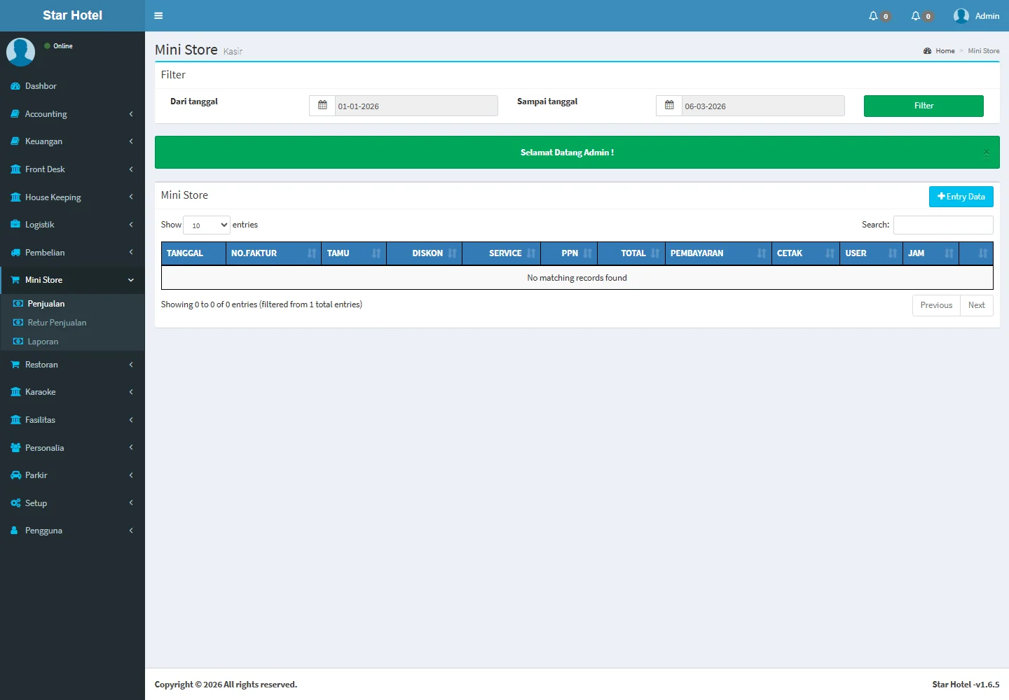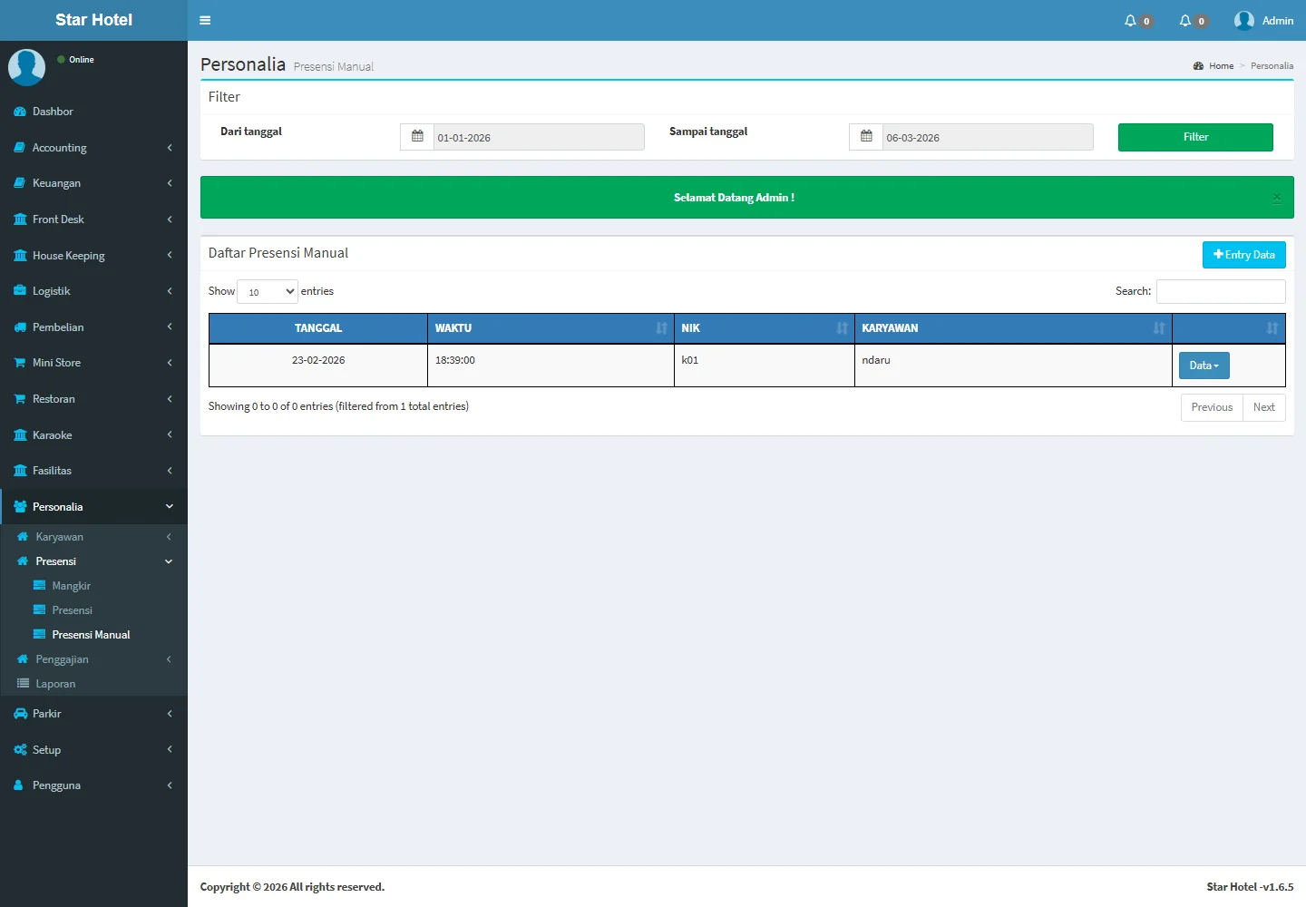 Starhotel dirancang untuk memudahkan pengelolaan hotel dalam satu platform terpadu. Tersedia lebih dari 15 modul penting, mulai dari Front Desk, Keuangan, Restoran, hingga Parkir. Semua terhubung dalam satu sistem yang rapi dan mudah digunakan.