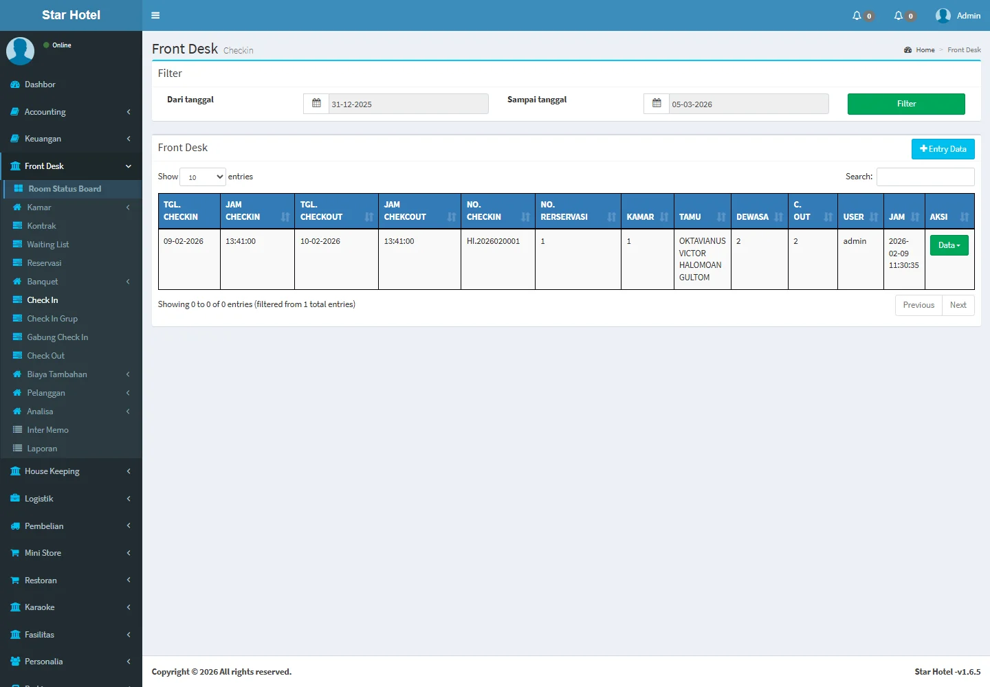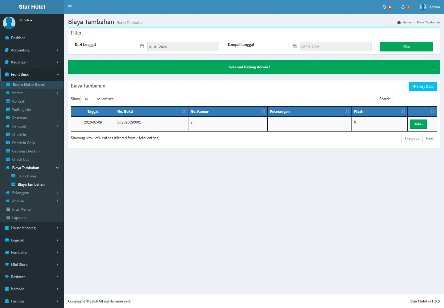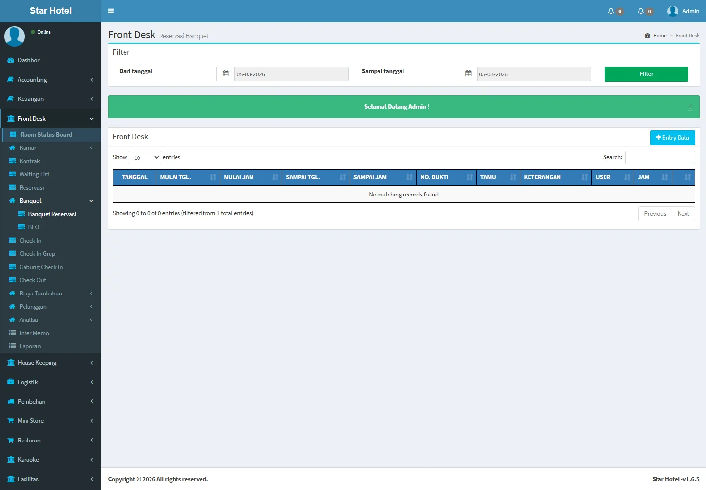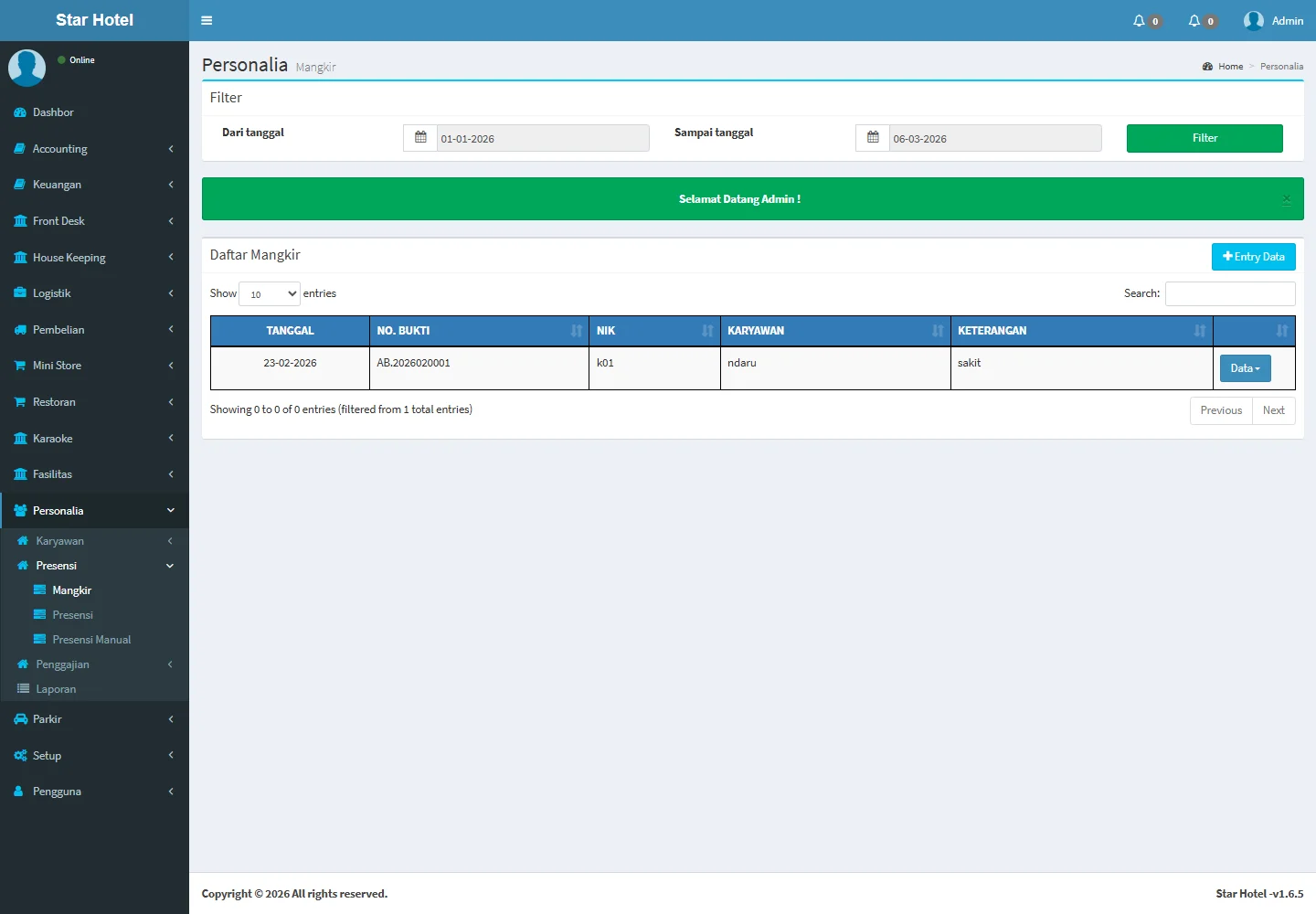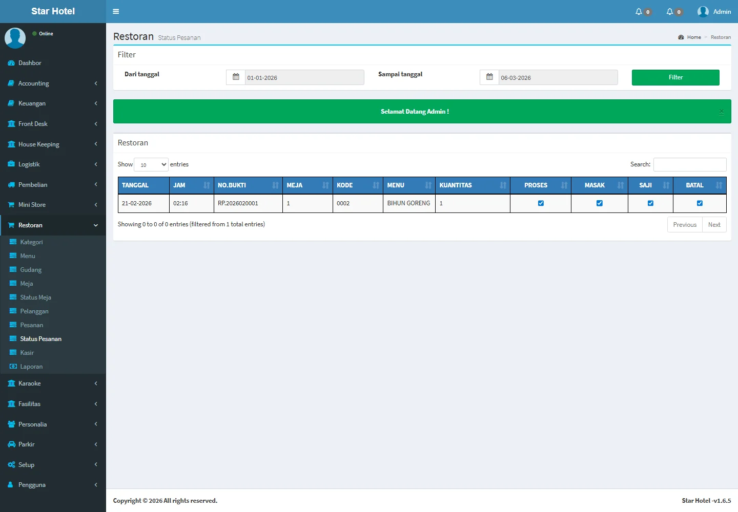 Starhotel dirancang untuk memudahkan pengelolaan hotel dalam satu platform terpadu. Tersedia lebih dari 15 modul penting, mulai dari Front Desk, Keuangan, Restoran, hingga Parkir. Semua terhubung dalam satu sistem yang rapi dan mudah digunakan.