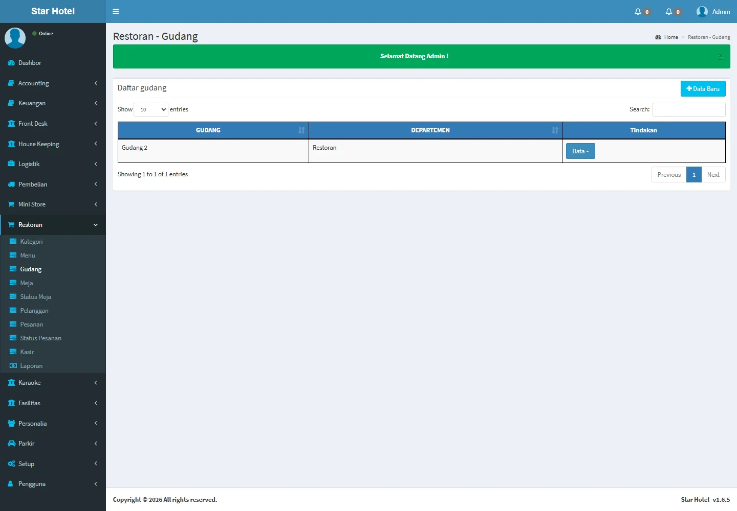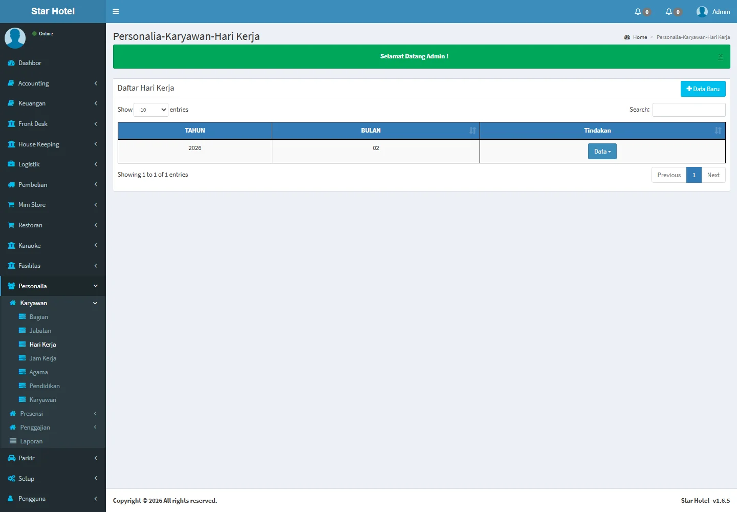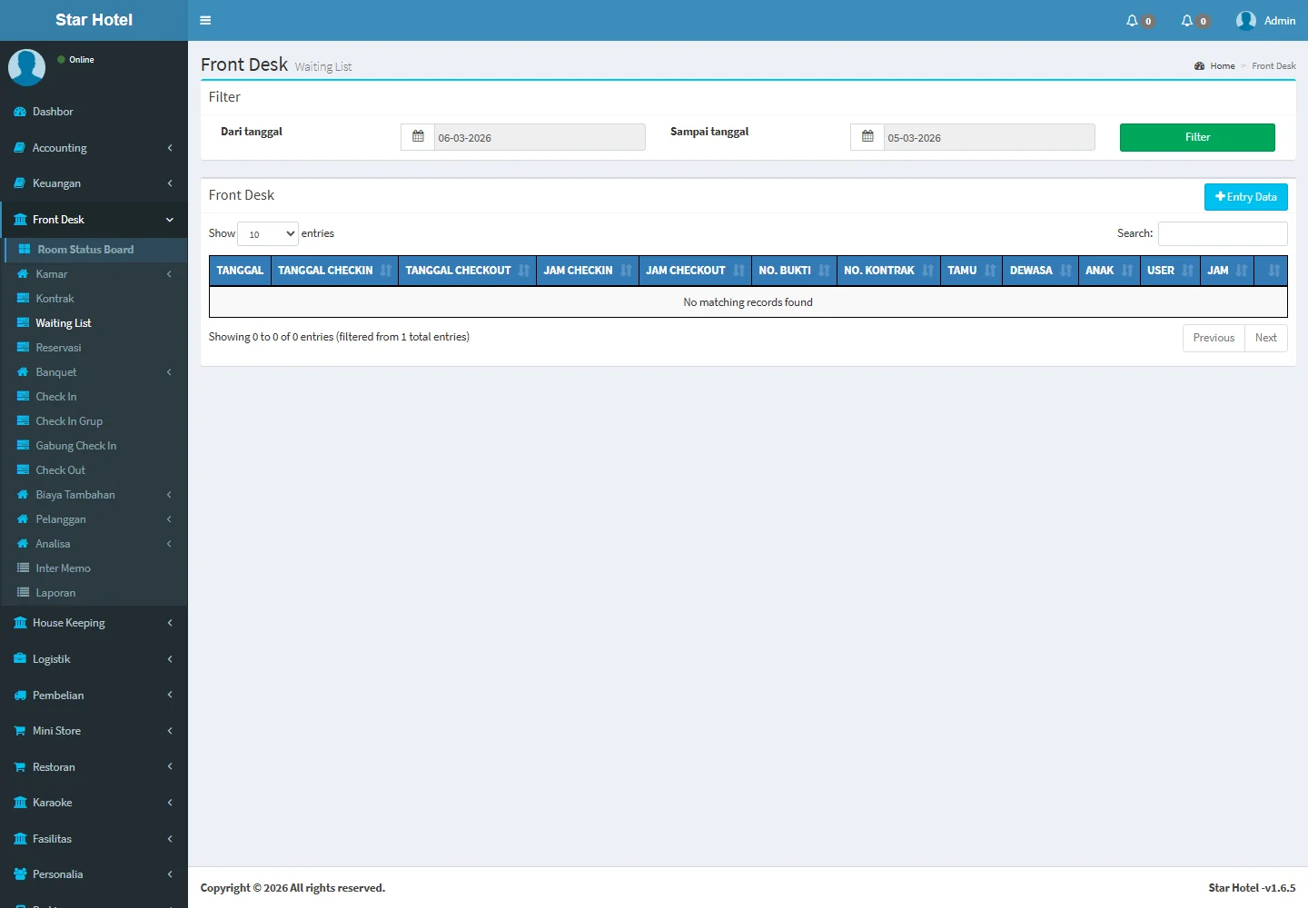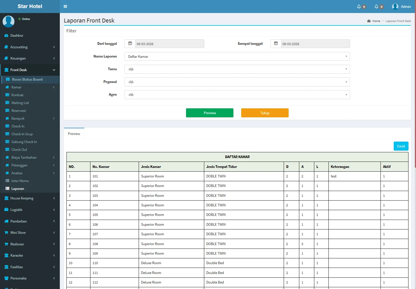 Starhotel dirancang untuk memudahkan pengelolaan hotel dalam satu platform terpadu. Tersedia lebih dari 15 modul penting, mulai dari Front Desk, Keuangan, Restoran, hingga Parkir. Semua terhubung dalam satu sistem yang rapi dan mudah digunakan.