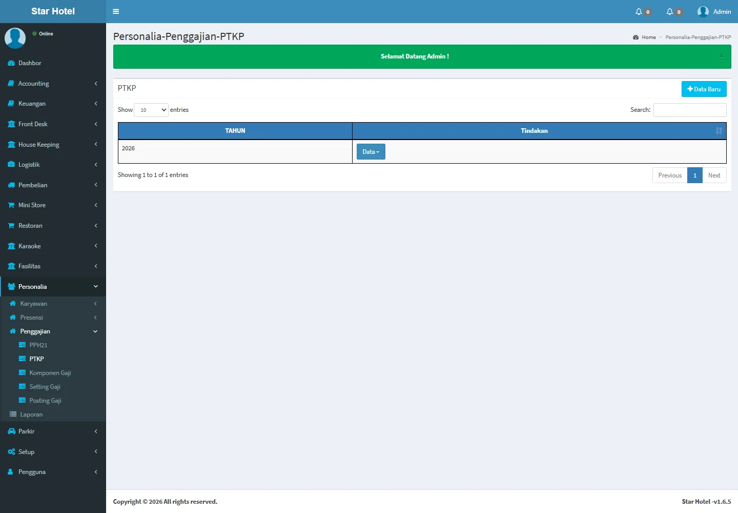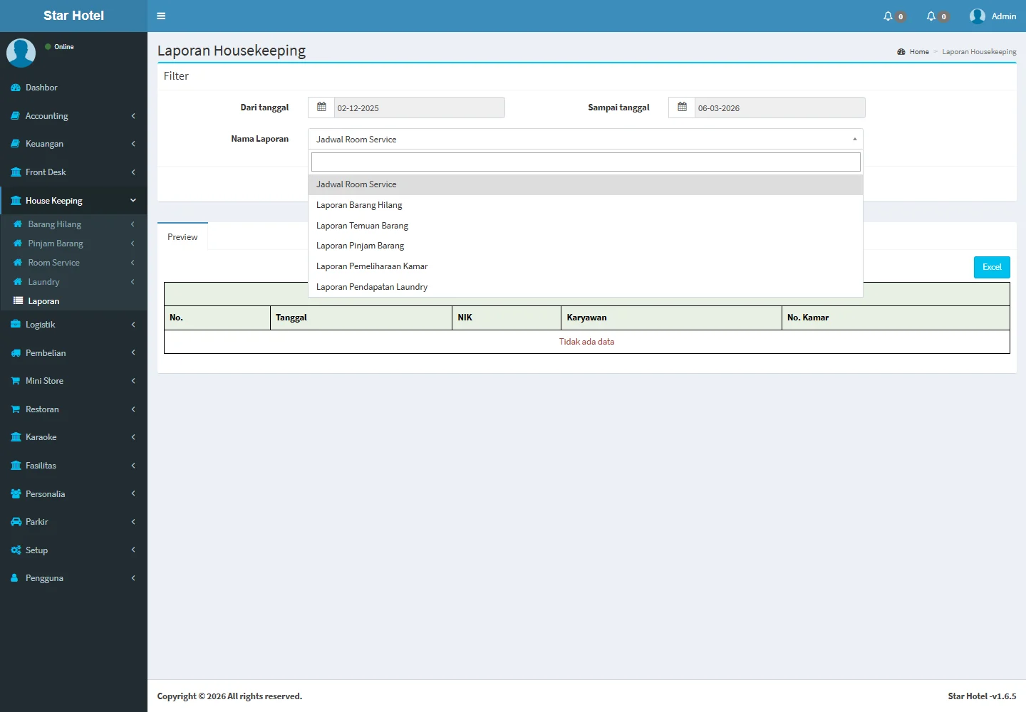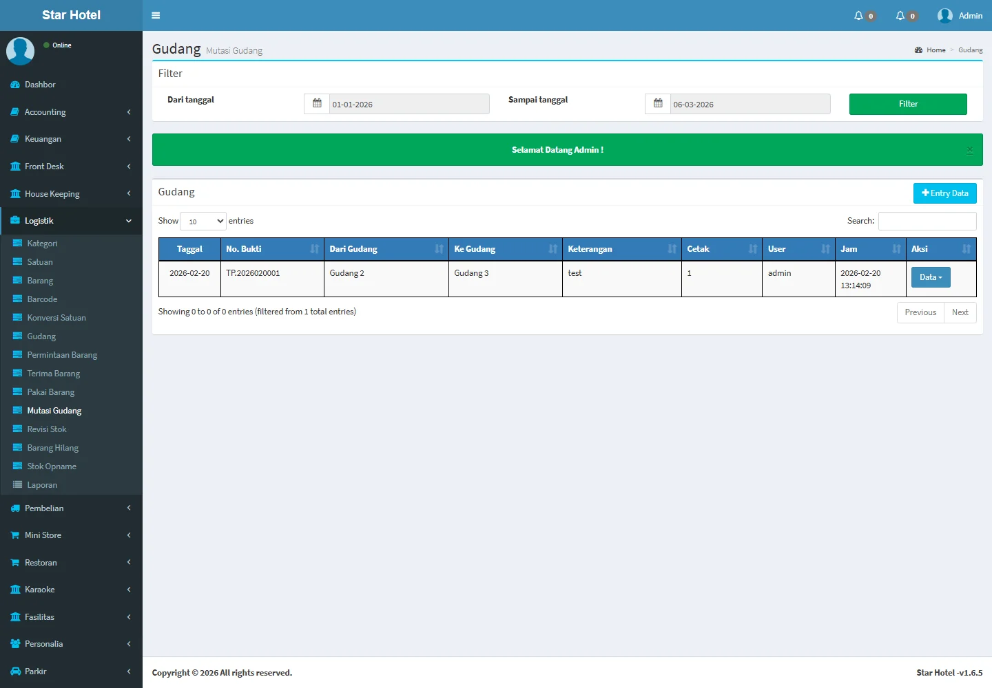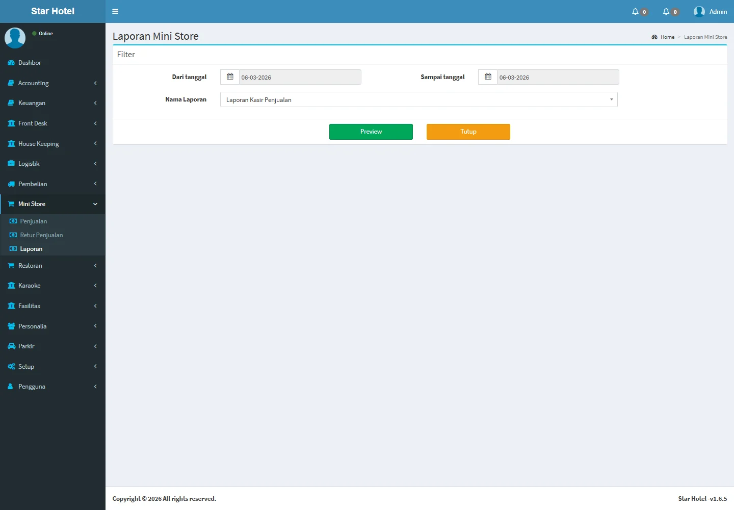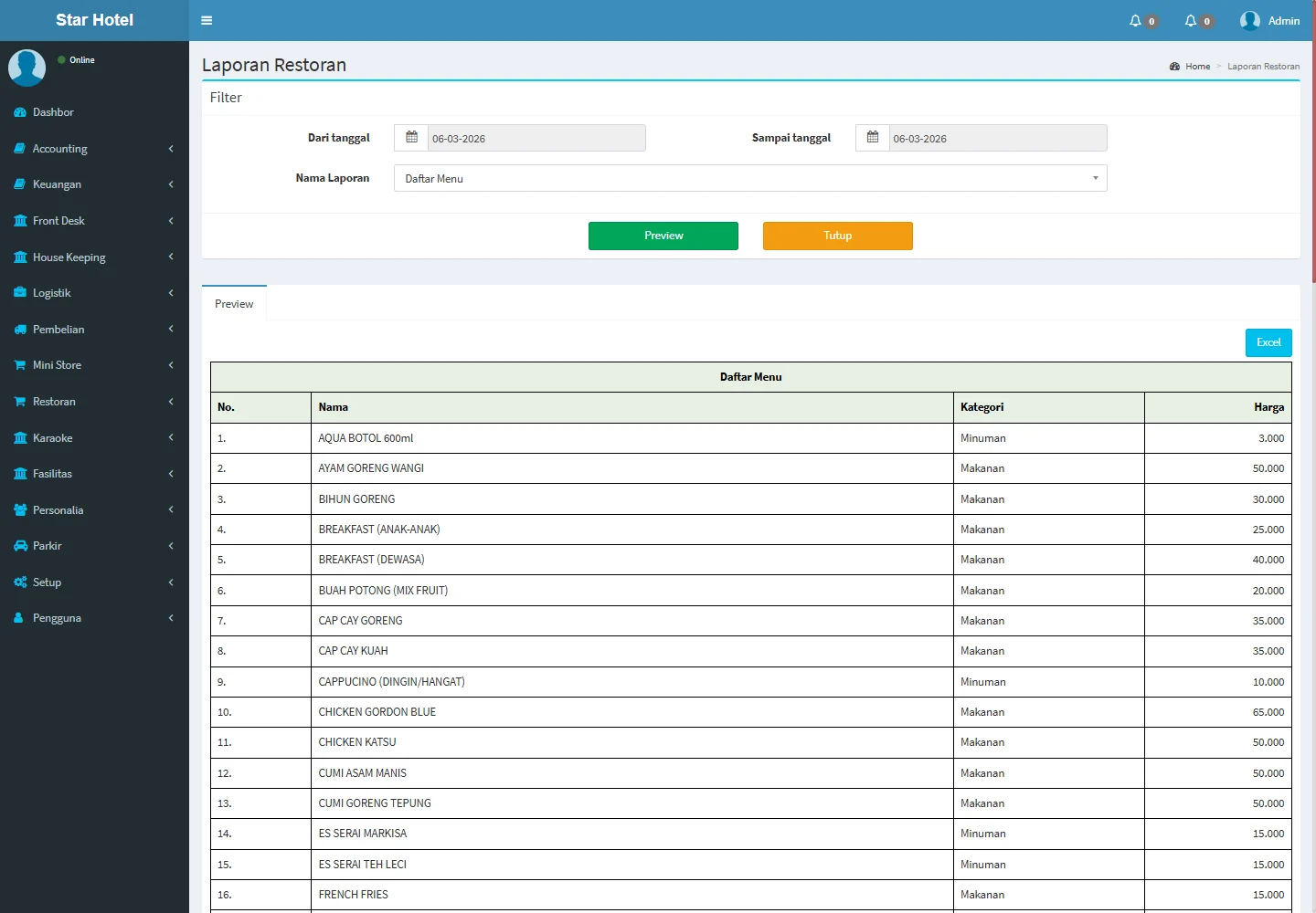 Starhotel dirancang untuk memudahkan pengelolaan hotel dalam satu platform terpadu. Tersedia lebih dari 15 modul penting, mulai dari Front Desk, Keuangan, Restoran, hingga Parkir. Semua terhubung dalam satu sistem yang rapi dan mudah digunakan.