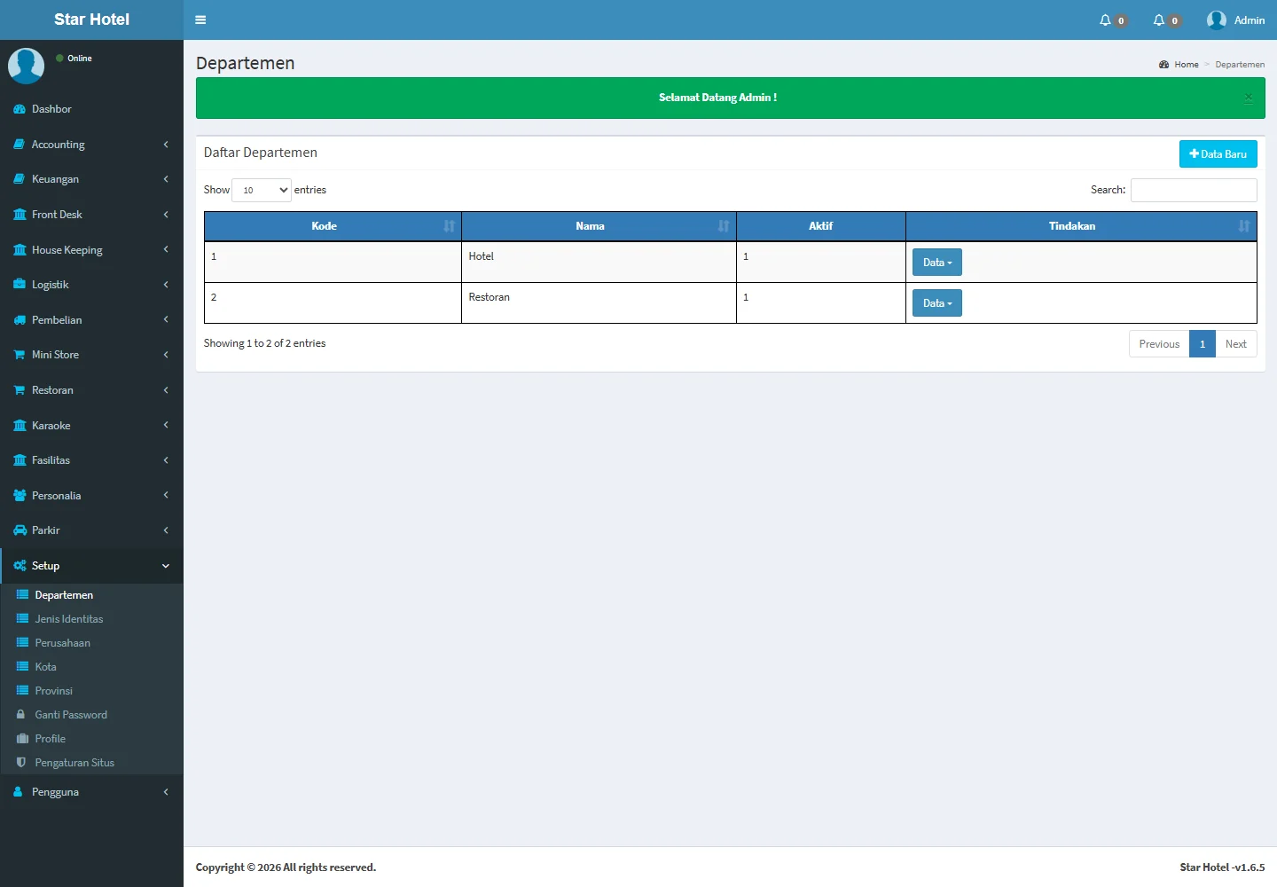 Kelola struktur departemen hotel dalam sistem. Pengaturan ini menjadi dasar pengelompokan data, akses modul, dan pelaporan per divisi.