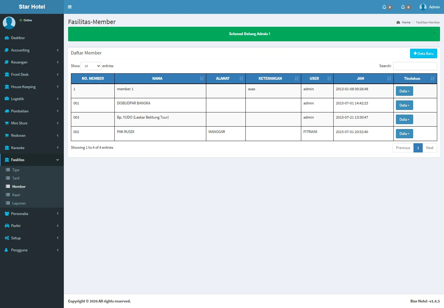 Kelola data member fasilitas hotel. Informasi meliputi identitas member, status keanggotaan, masa aktif, serta riwayat penggunaan fasilitas.