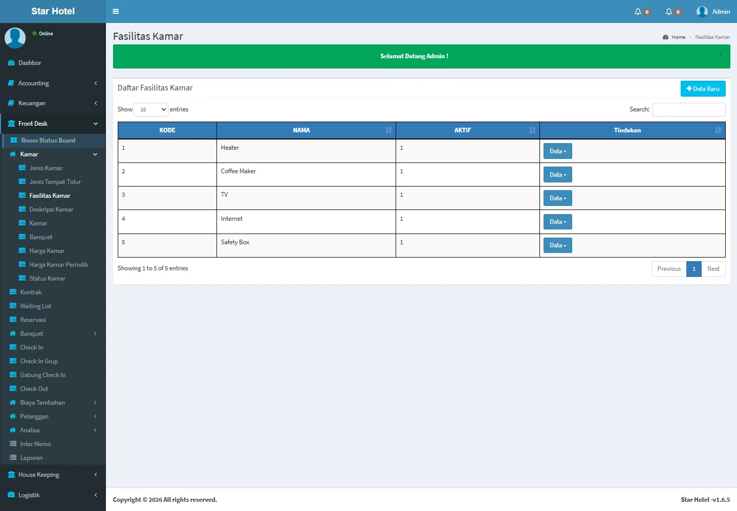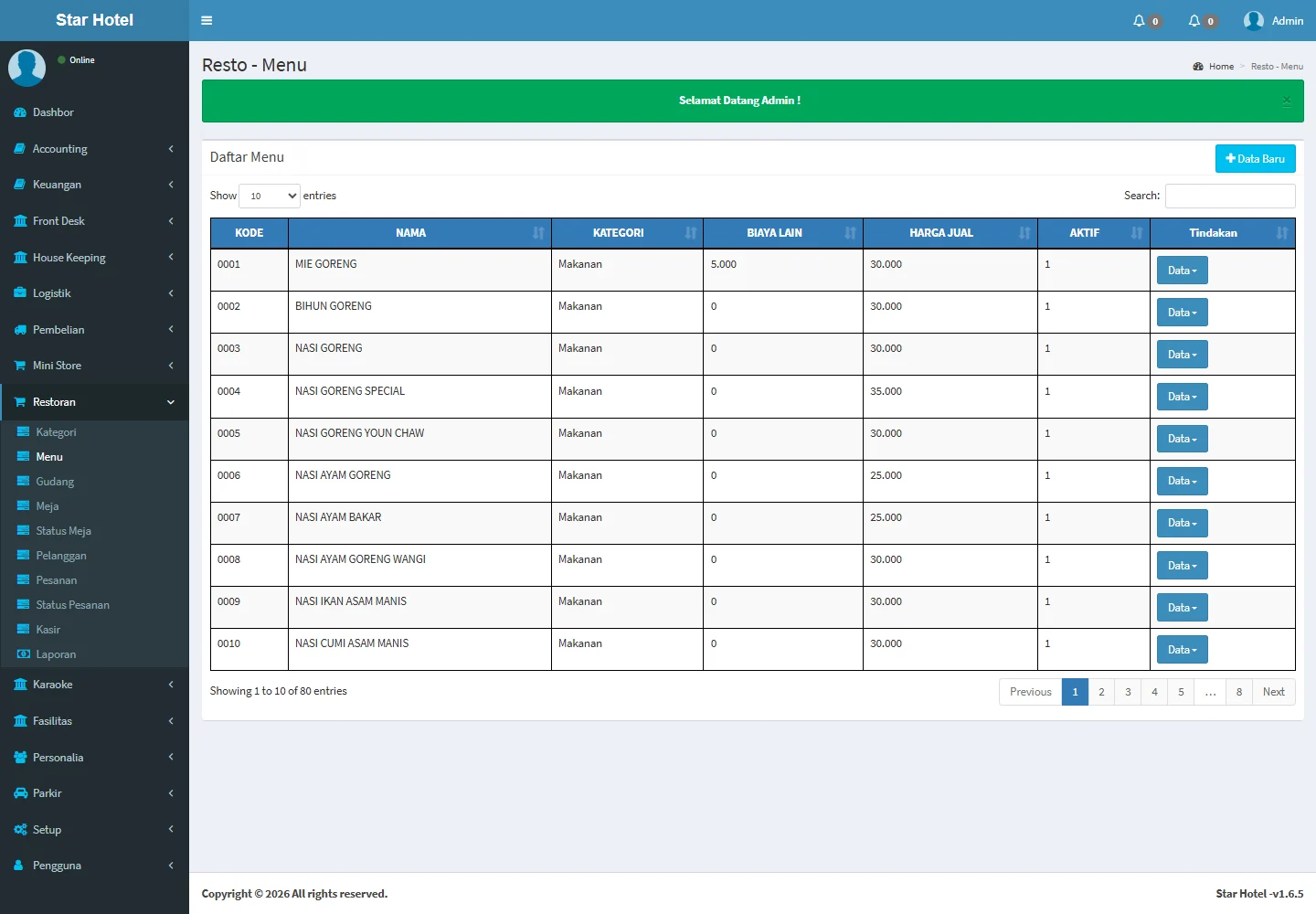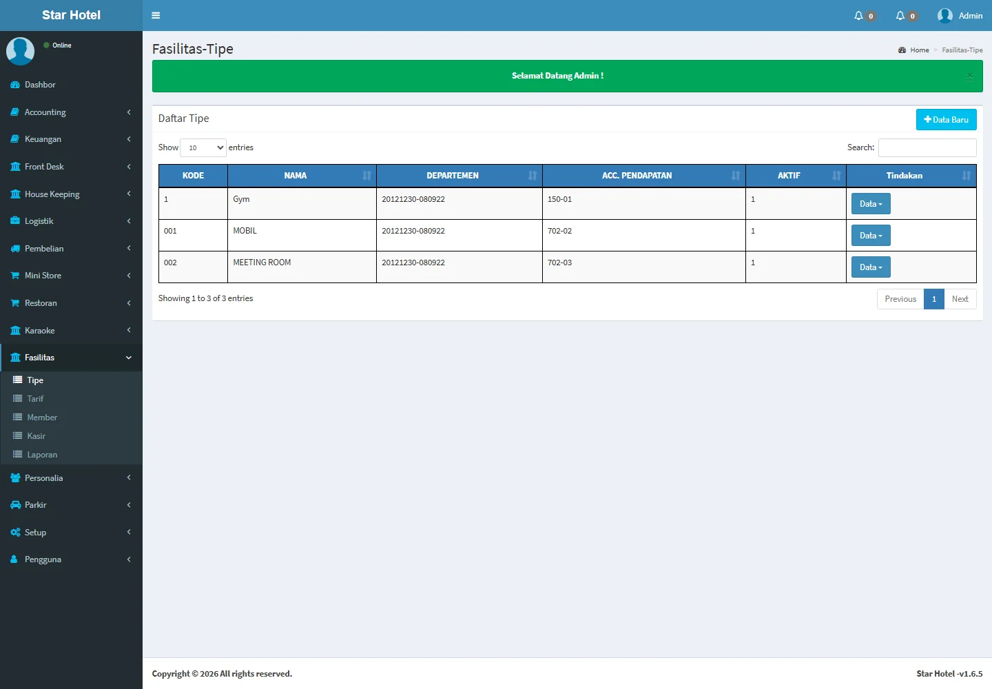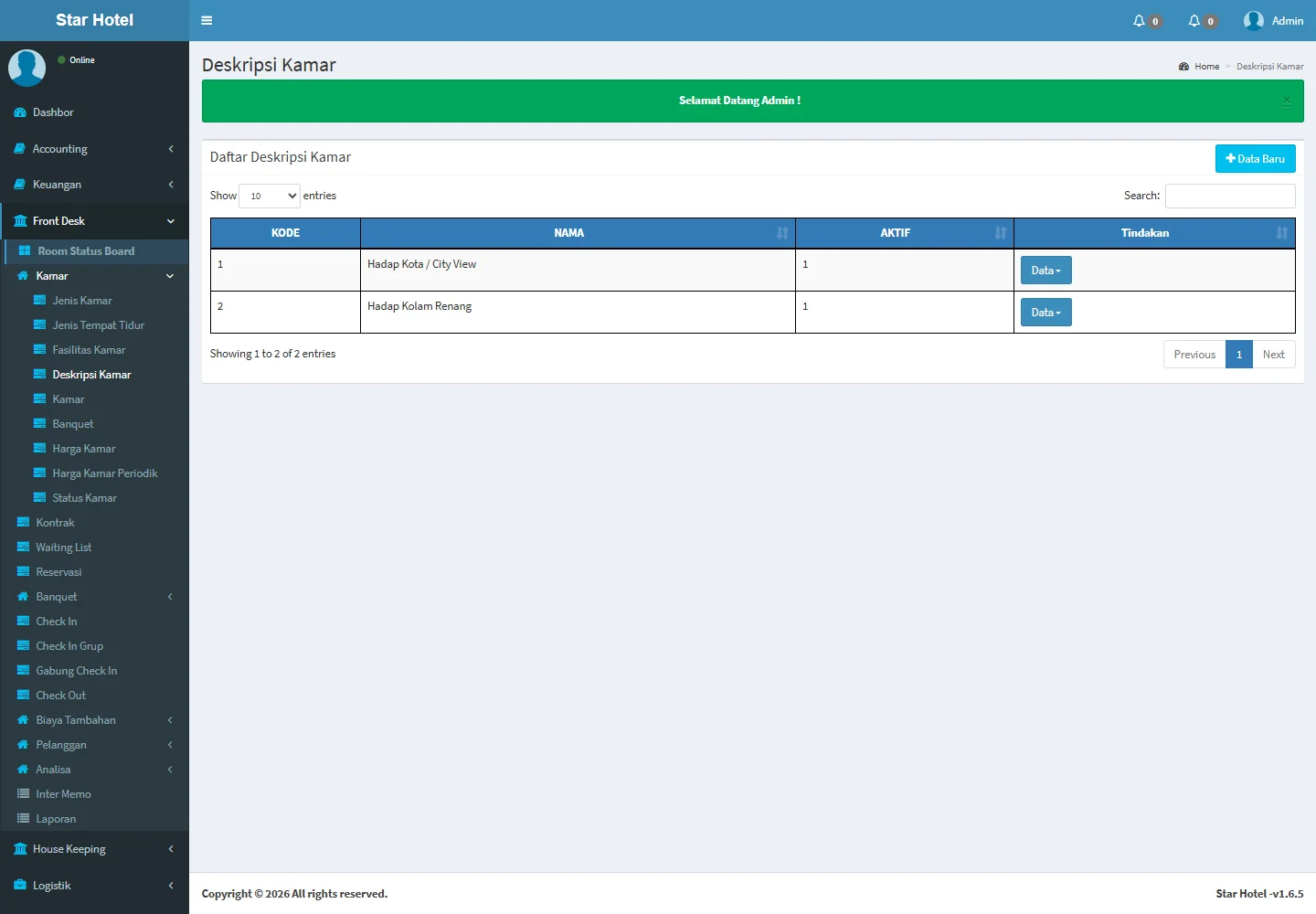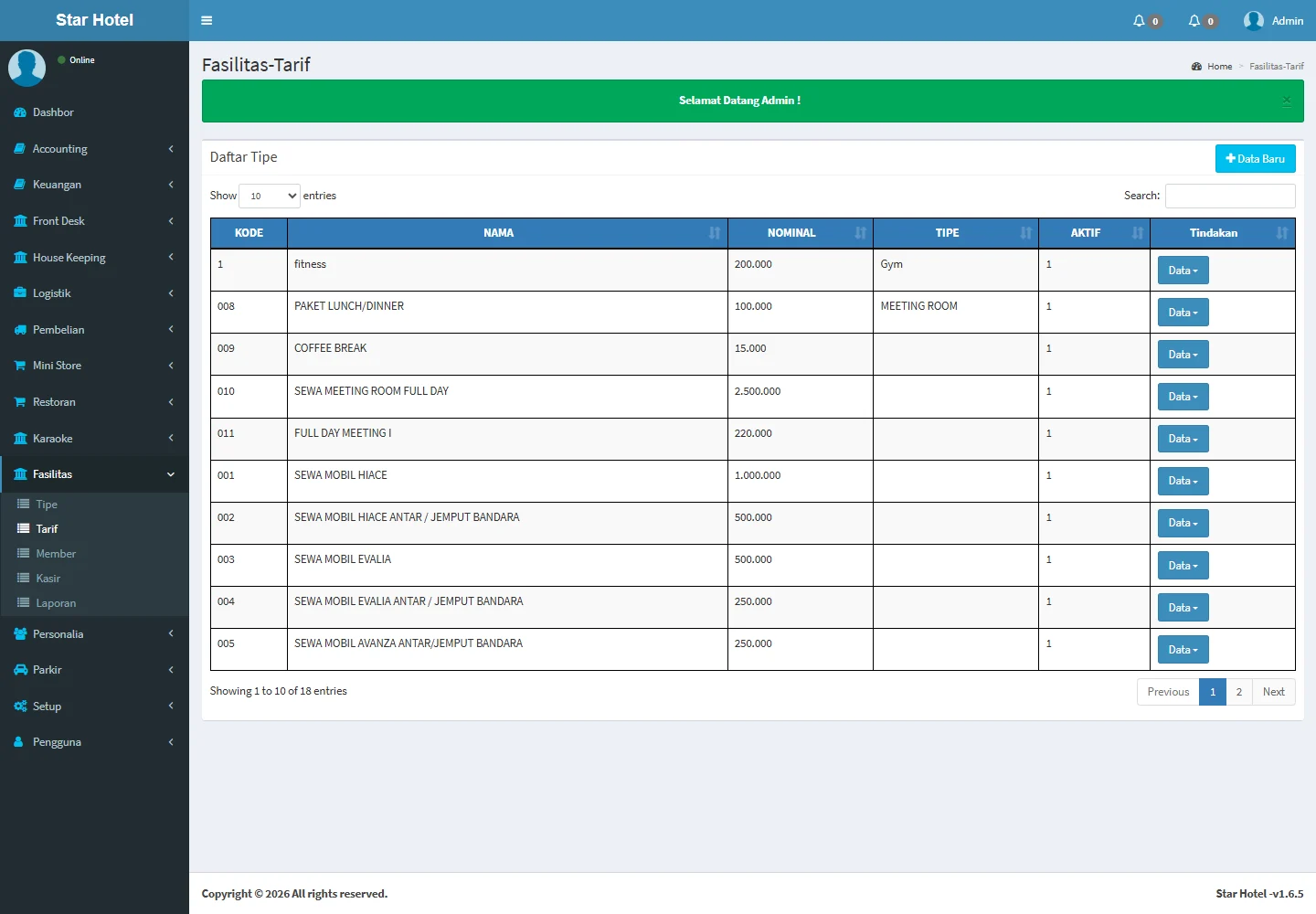 Masukkan data kamar, tarif, staf, dan departemen hotel. Semua bisa diatur langsung tanpa perlu coding.