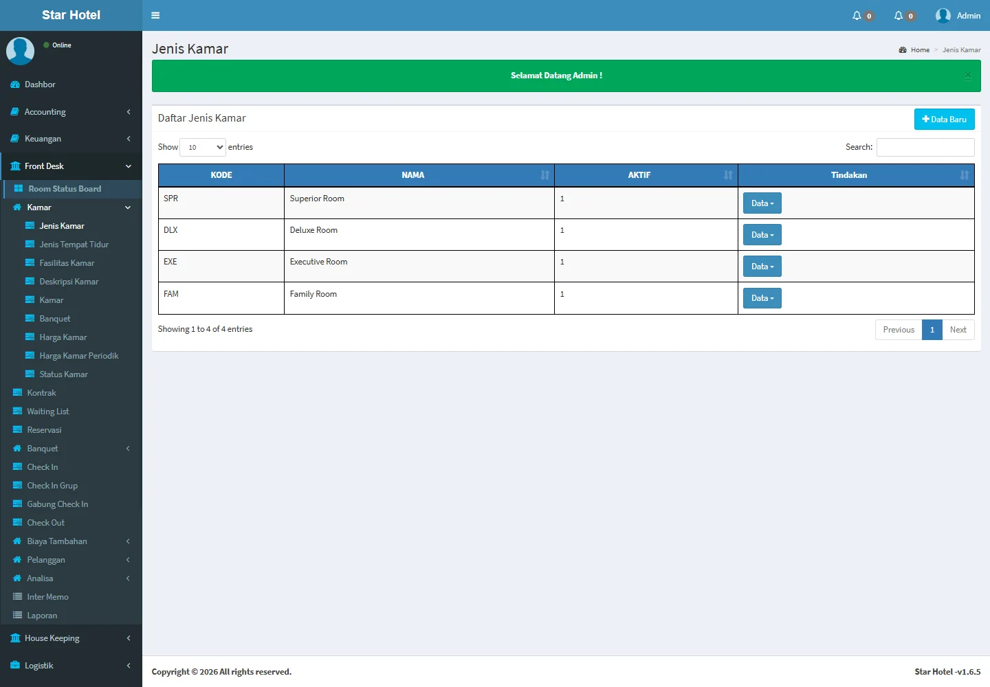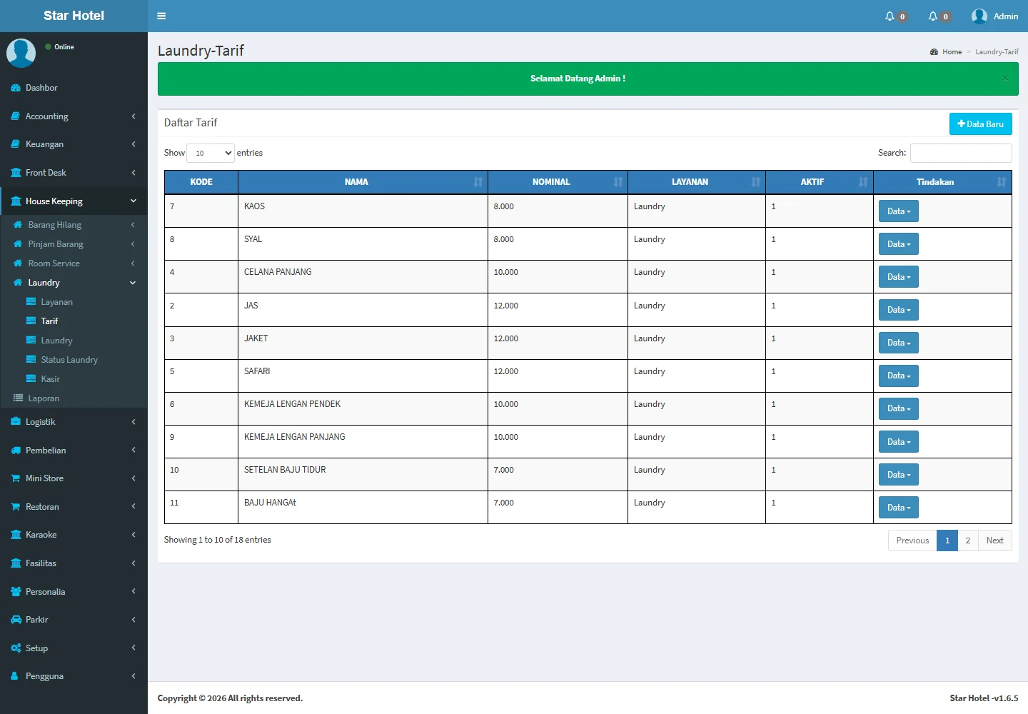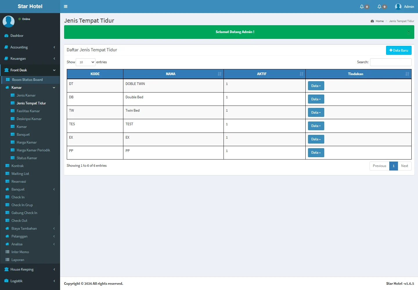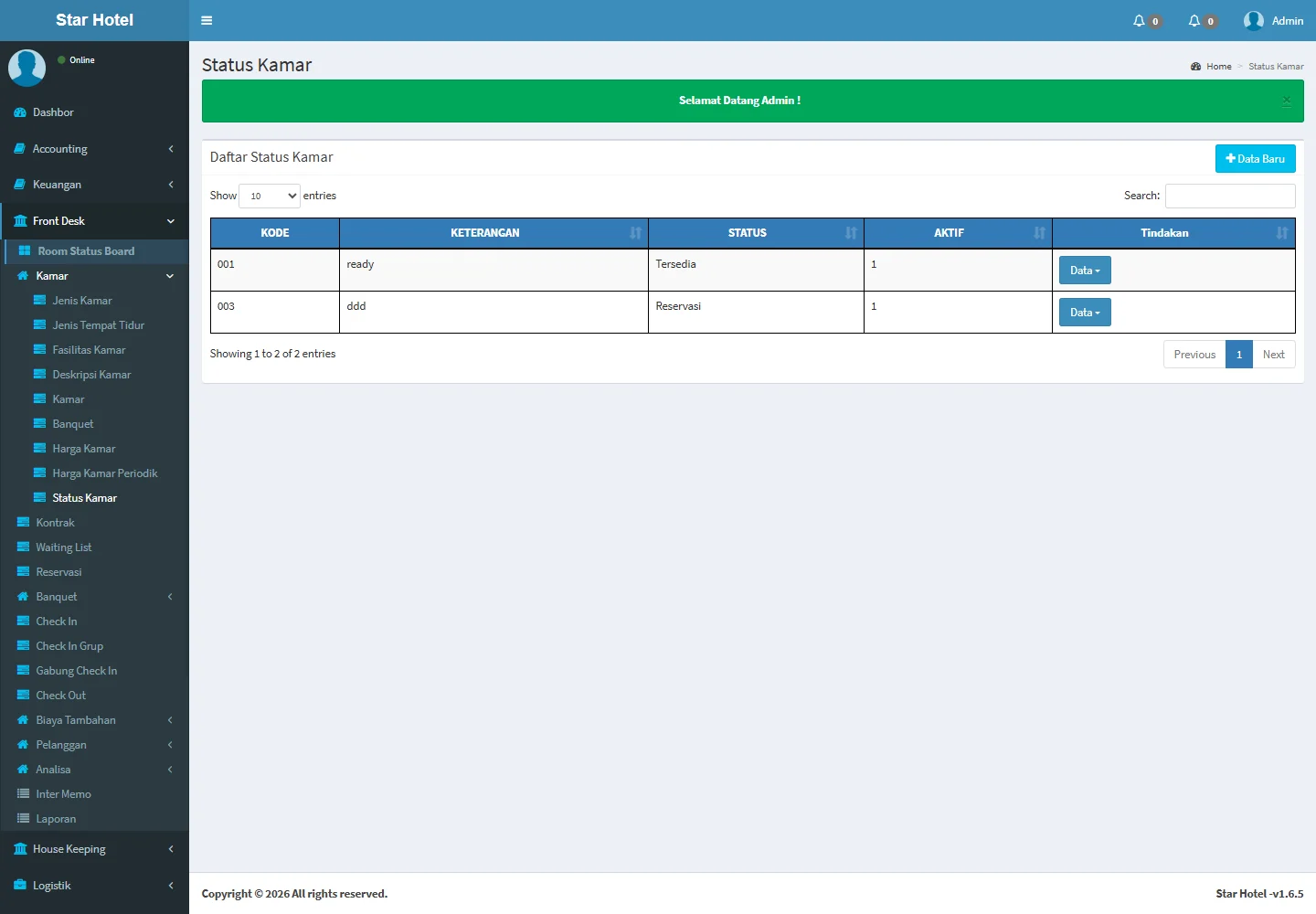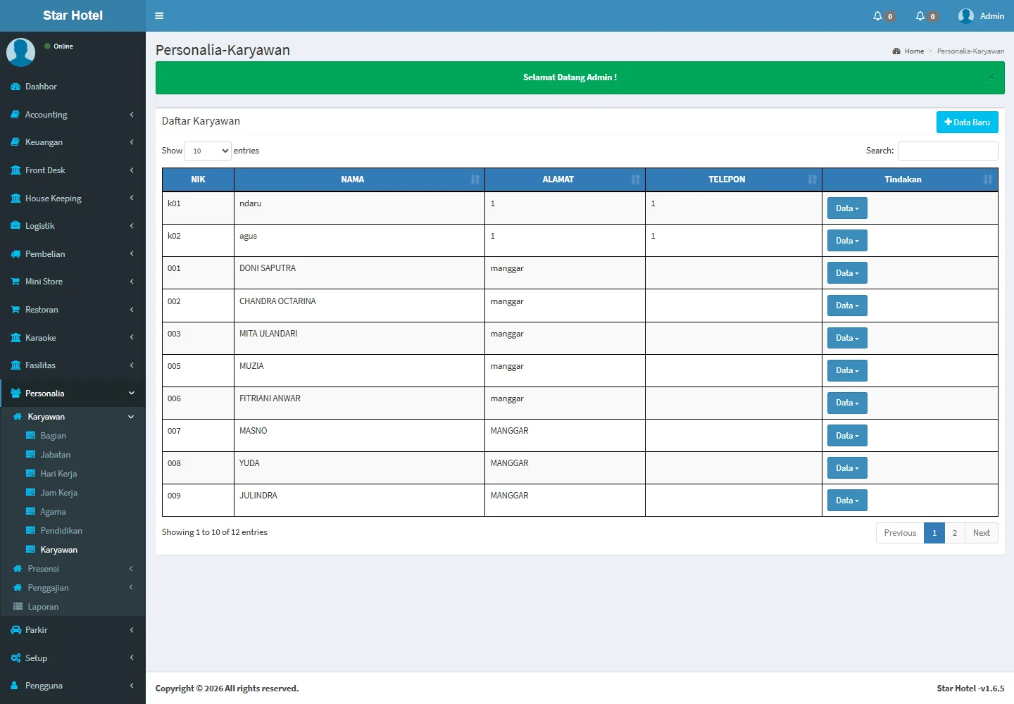 Masukkan data kamar, tarif, staf, dan departemen hotel. Semua bisa diatur langsung tanpa perlu coding.