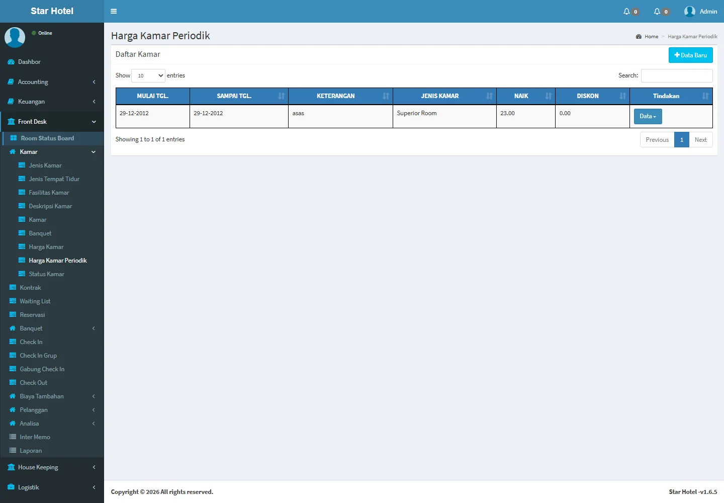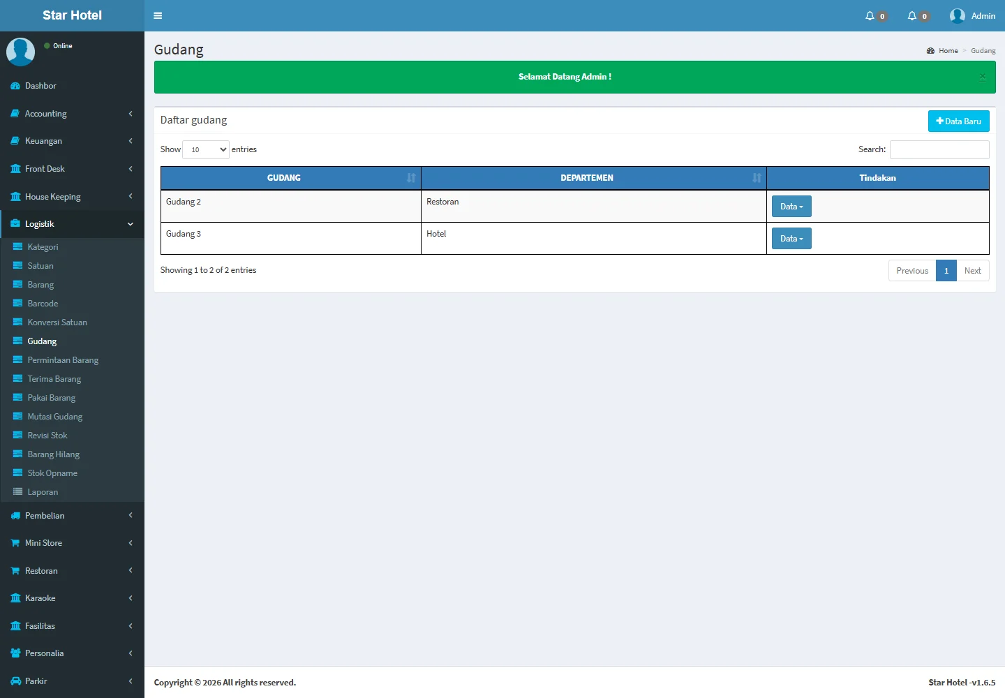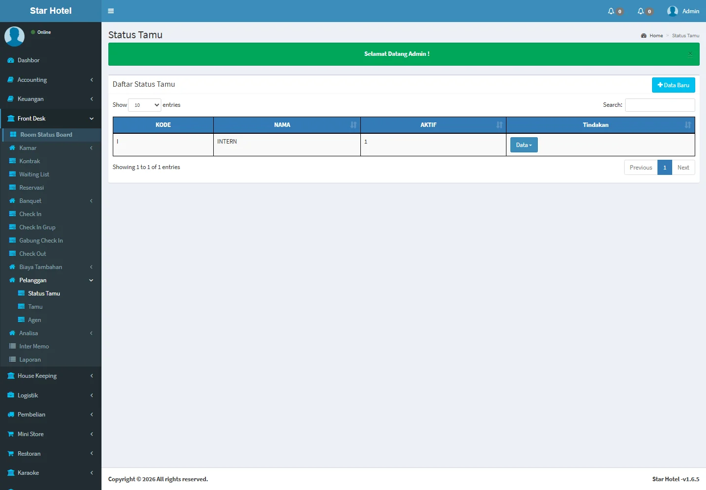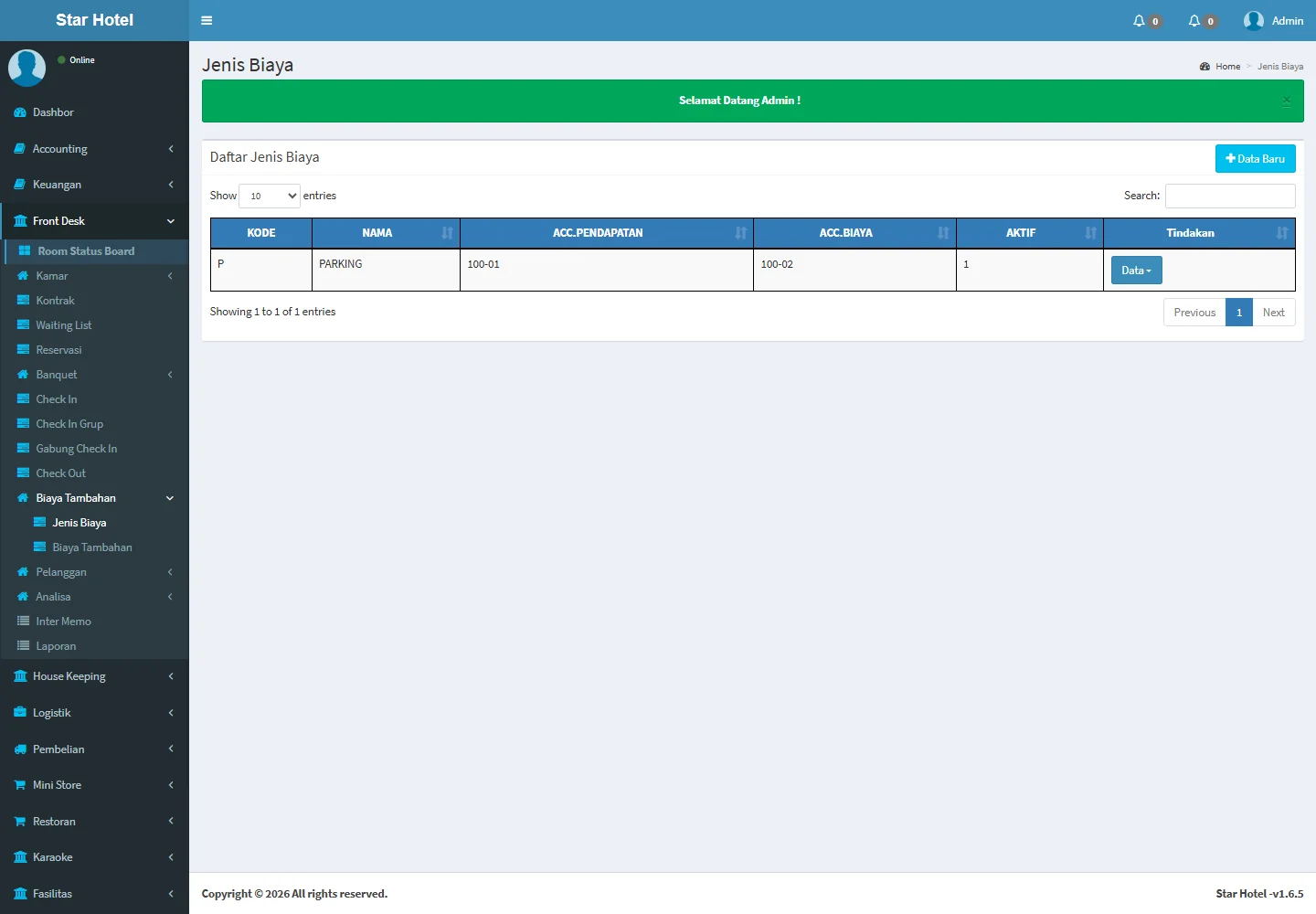 Masukkan data kamar, tarif, staf, dan departemen hotel. Semua bisa diatur langsung tanpa perlu coding.
