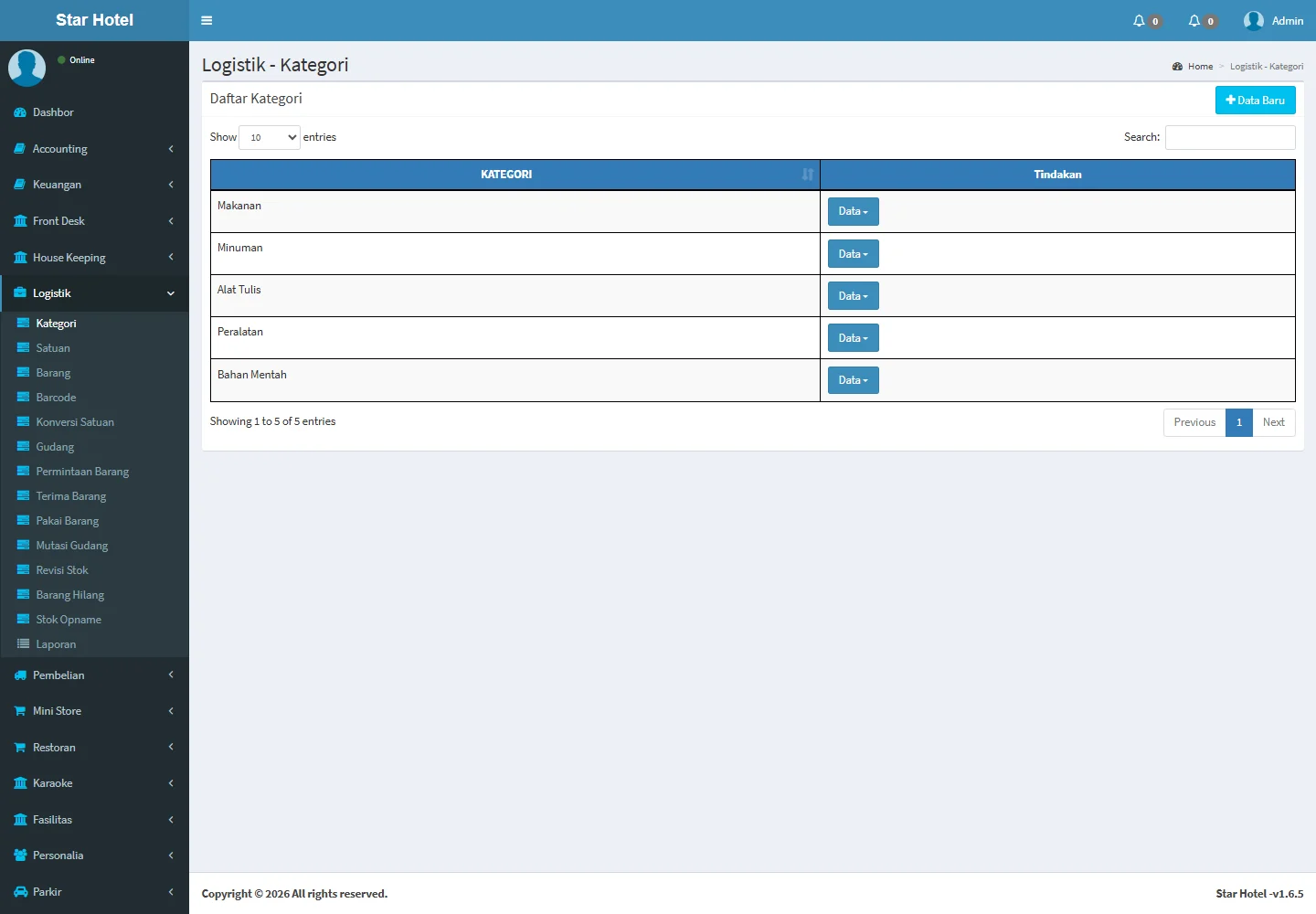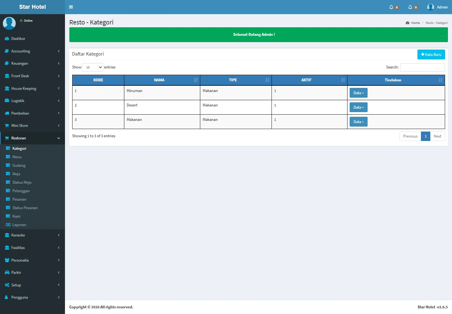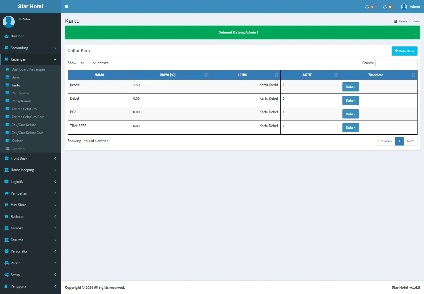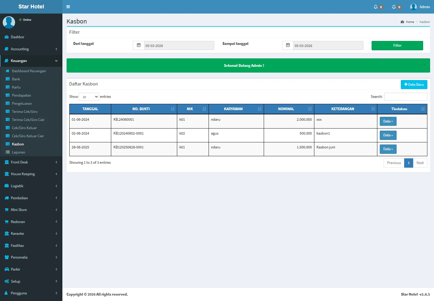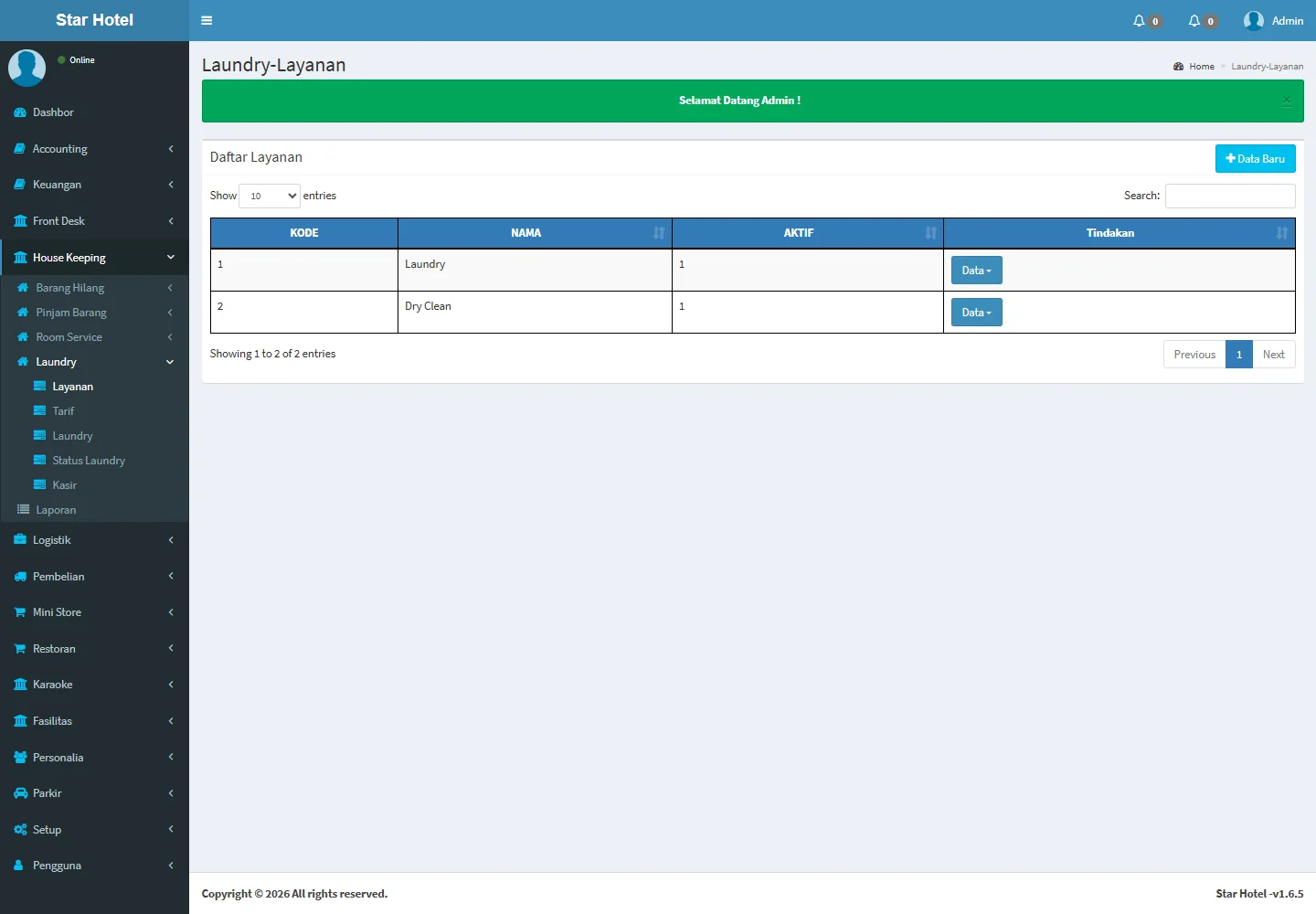 Masukkan data kamar, tarif, staf, dan departemen hotel. Semua bisa diatur langsung tanpa perlu coding.
