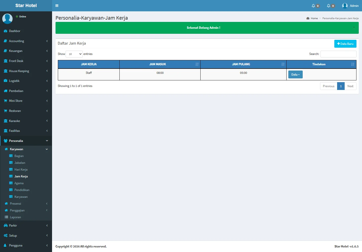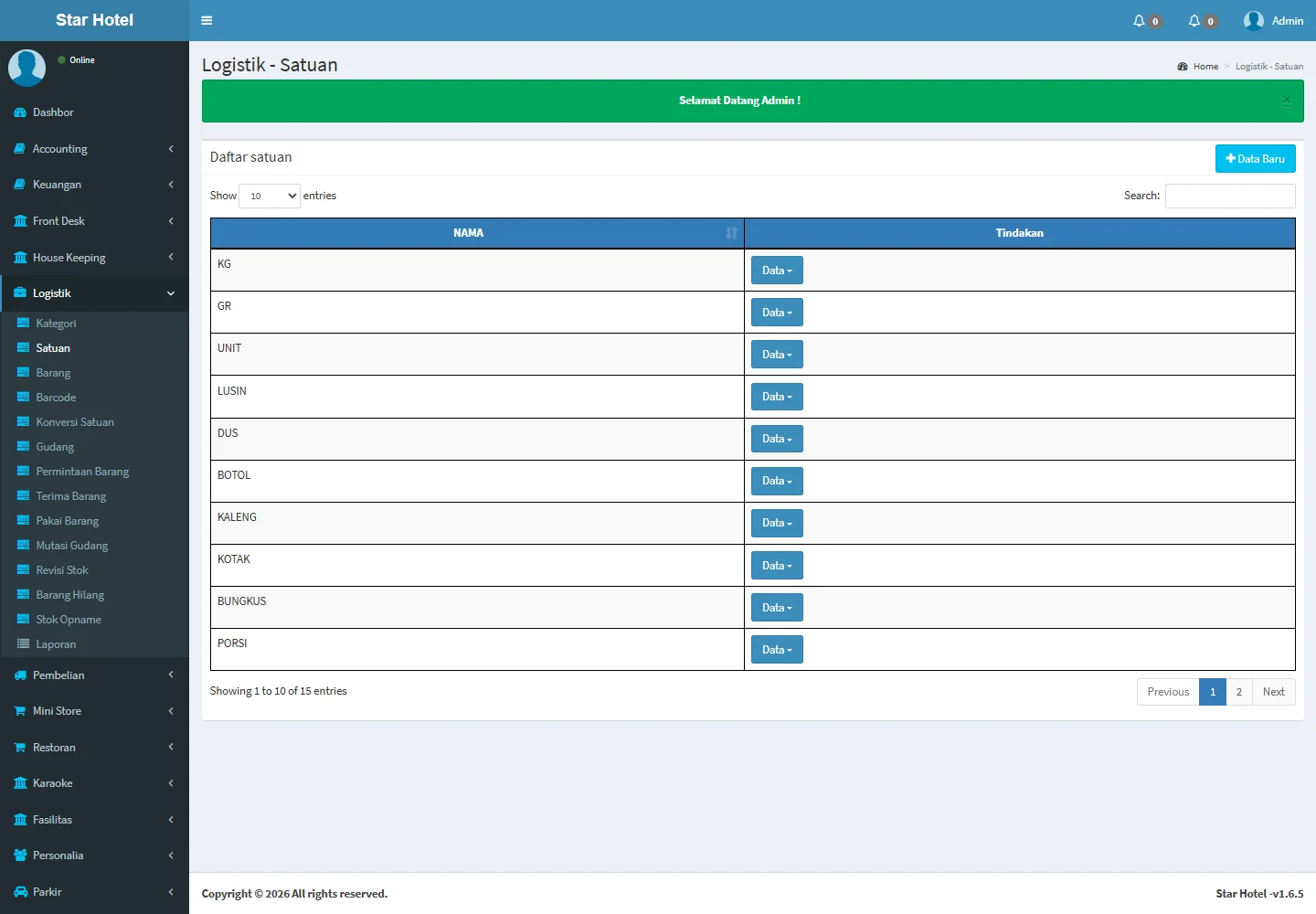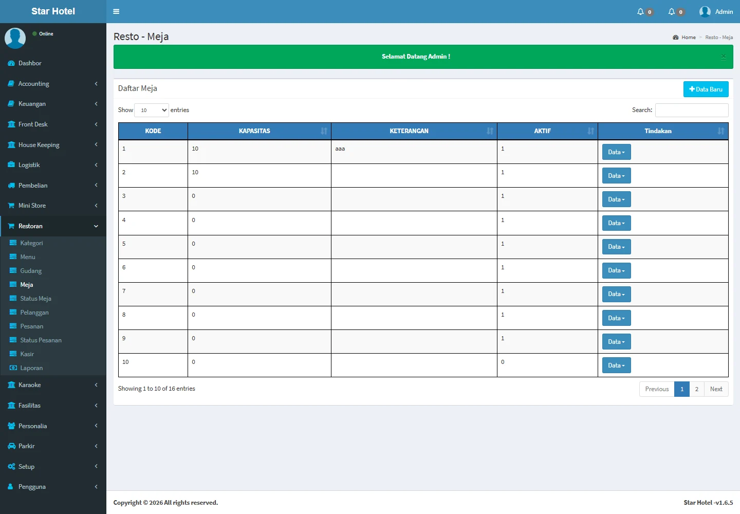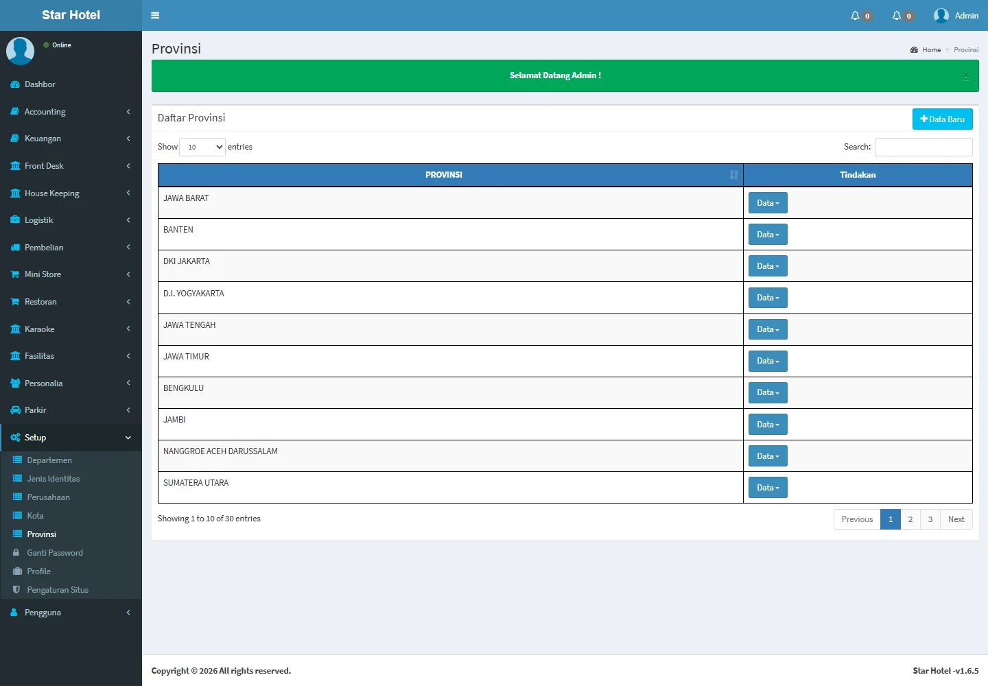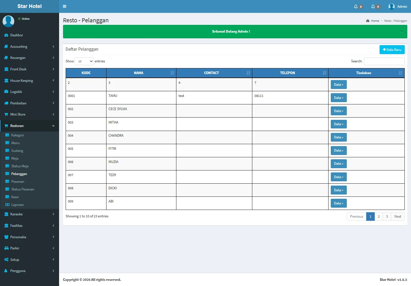 Masukkan data kamar, tarif, staf, dan departemen hotel. Semua bisa diatur langsung tanpa perlu coding.
