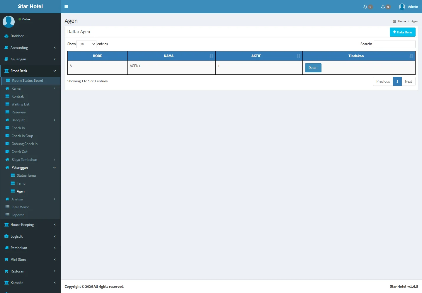 Agen Kelola data agen yang bekerja sama dengan hotel mana yang masih aktif dan mana yang sudah tidak aktif.