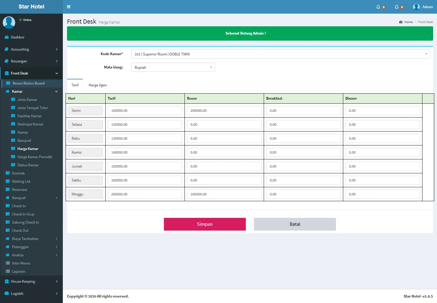Setting tarif kamar standar per tipe dan musim. Atur harga weekday, weekend, high season dengan fleksibilitas penuh.