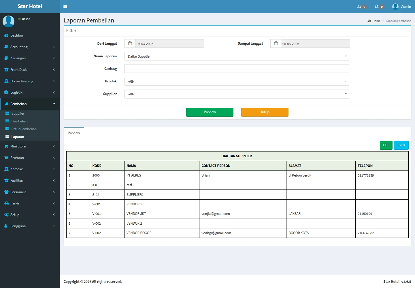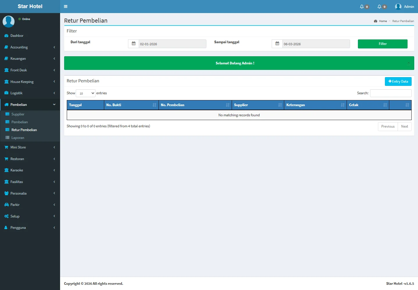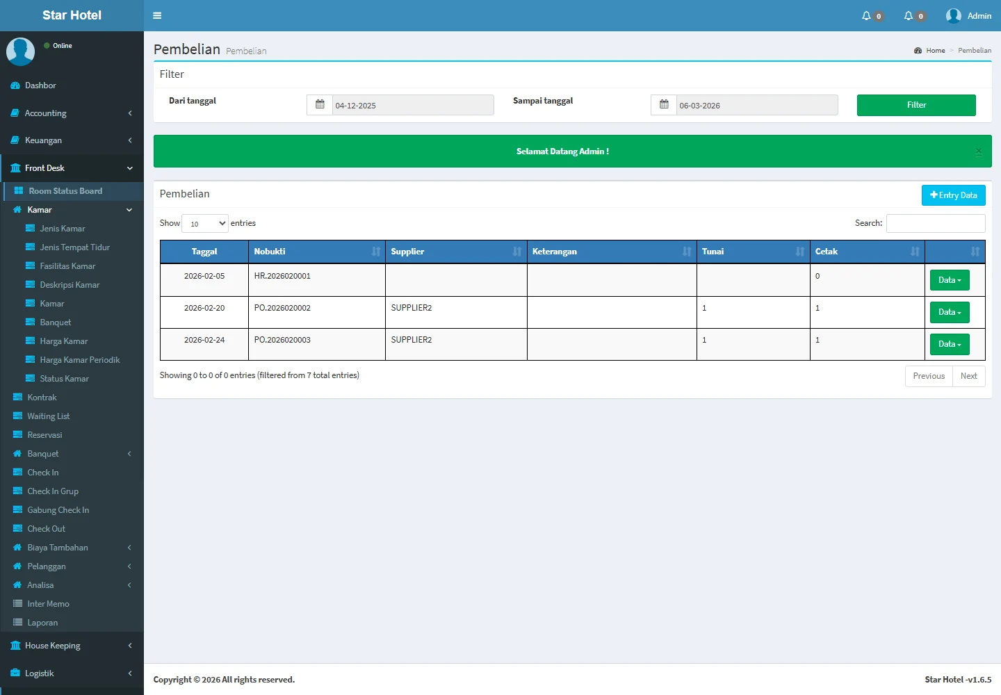 Kelola seluruh proses pengadaan barang dan jasa hotel. Dari manajemen supplier, pembuatan PO, penerimaan barang, hingga retur pembelian.