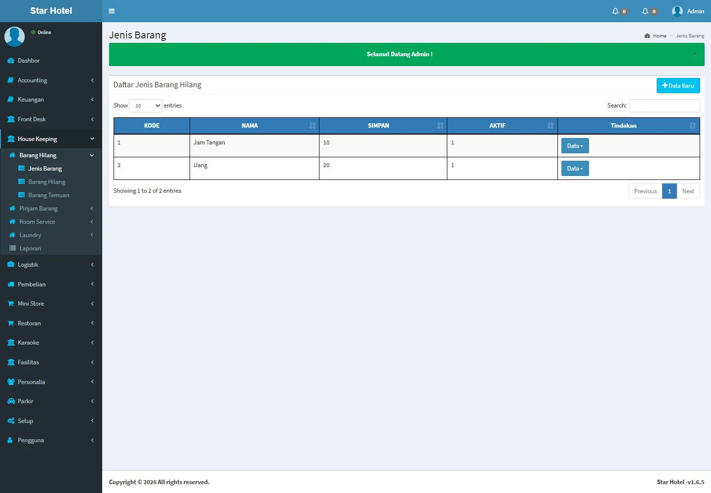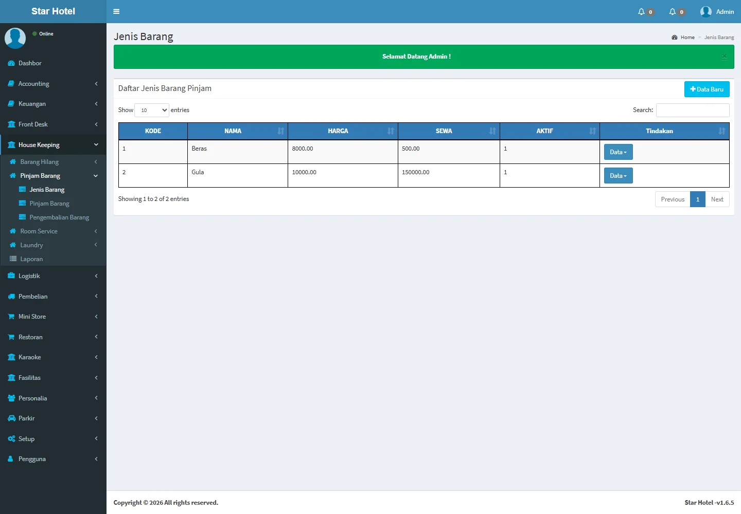 Kelola data jenis barang yang tersedia untuk dipinjam oleh tamu, seperti hair dryer, setrika, adaptor, atau perlengkapan lainnya.