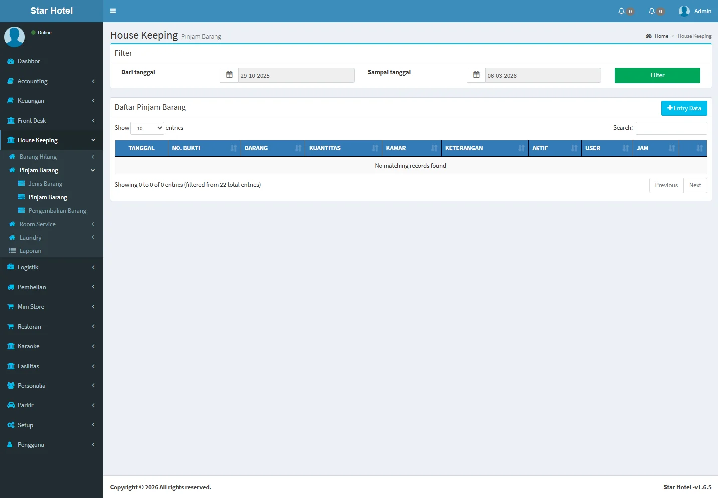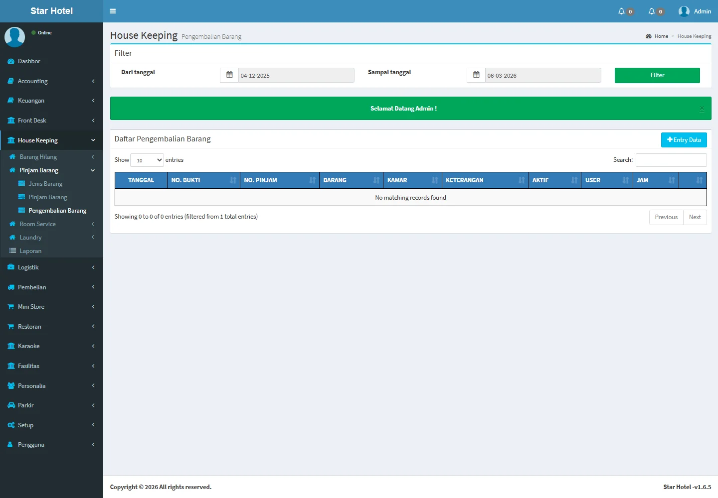 Pencatatan data peminjaman barang oleh tamu atau kamar tertentu. Sistem mencatat jenis barang, jumlah, waktu peminjaman, dan petugas yang melayani.