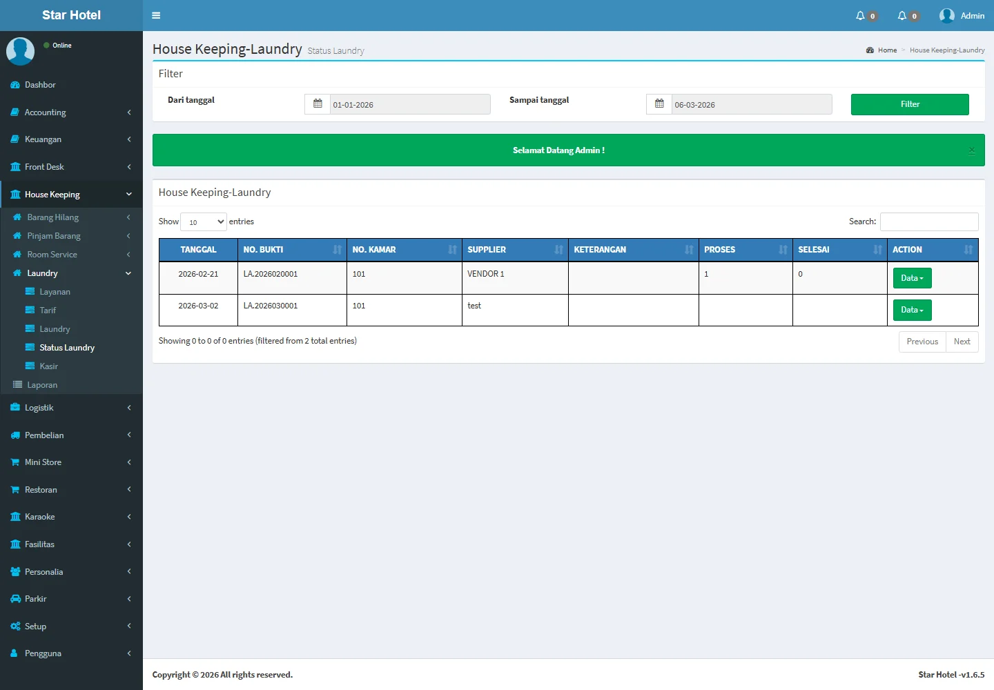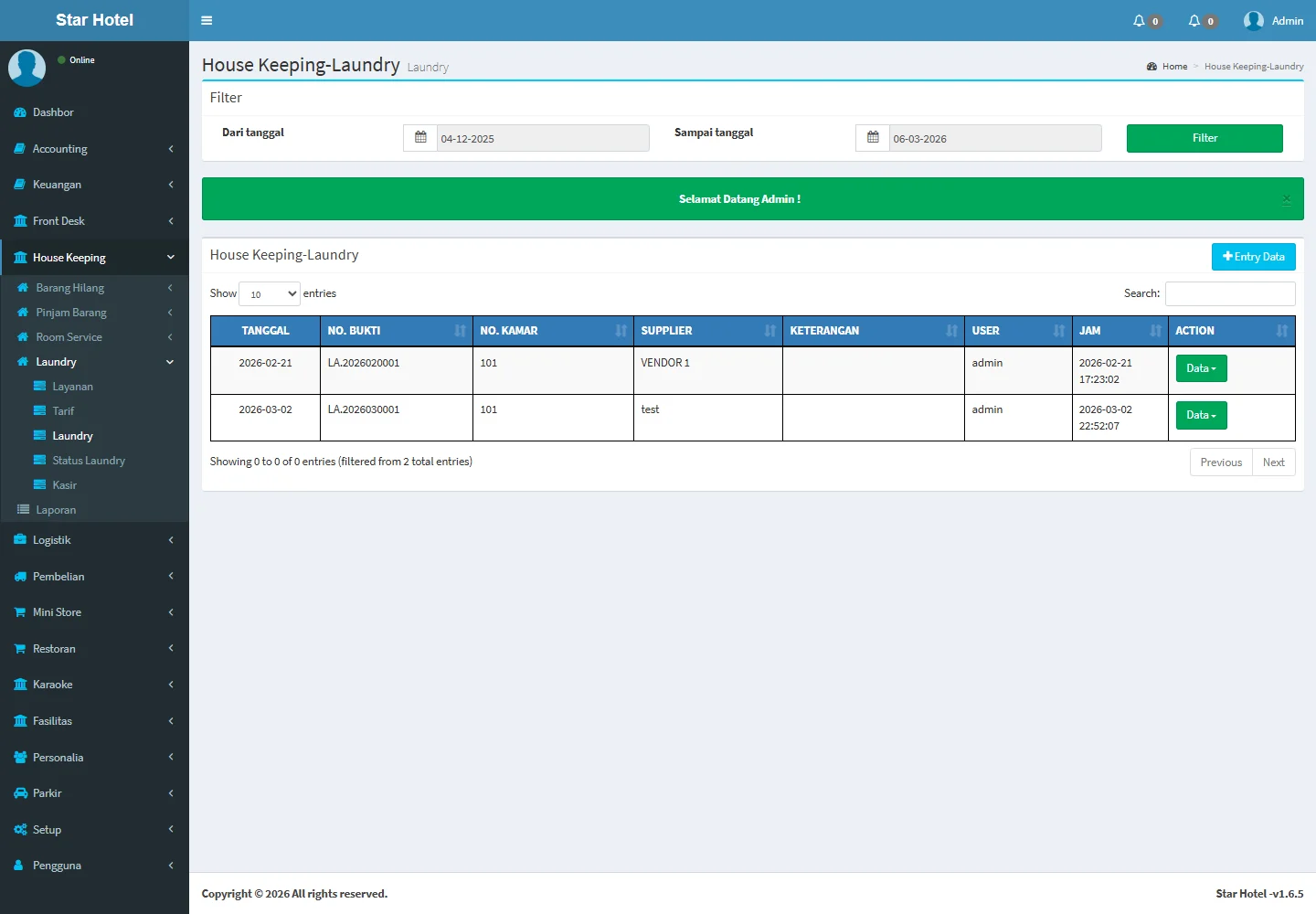 Menganalisa pembayaran laundry langsung di kasir atau charge ke tagihan kamar tamu. Rekap pendapatan laundry harian otomatis.
