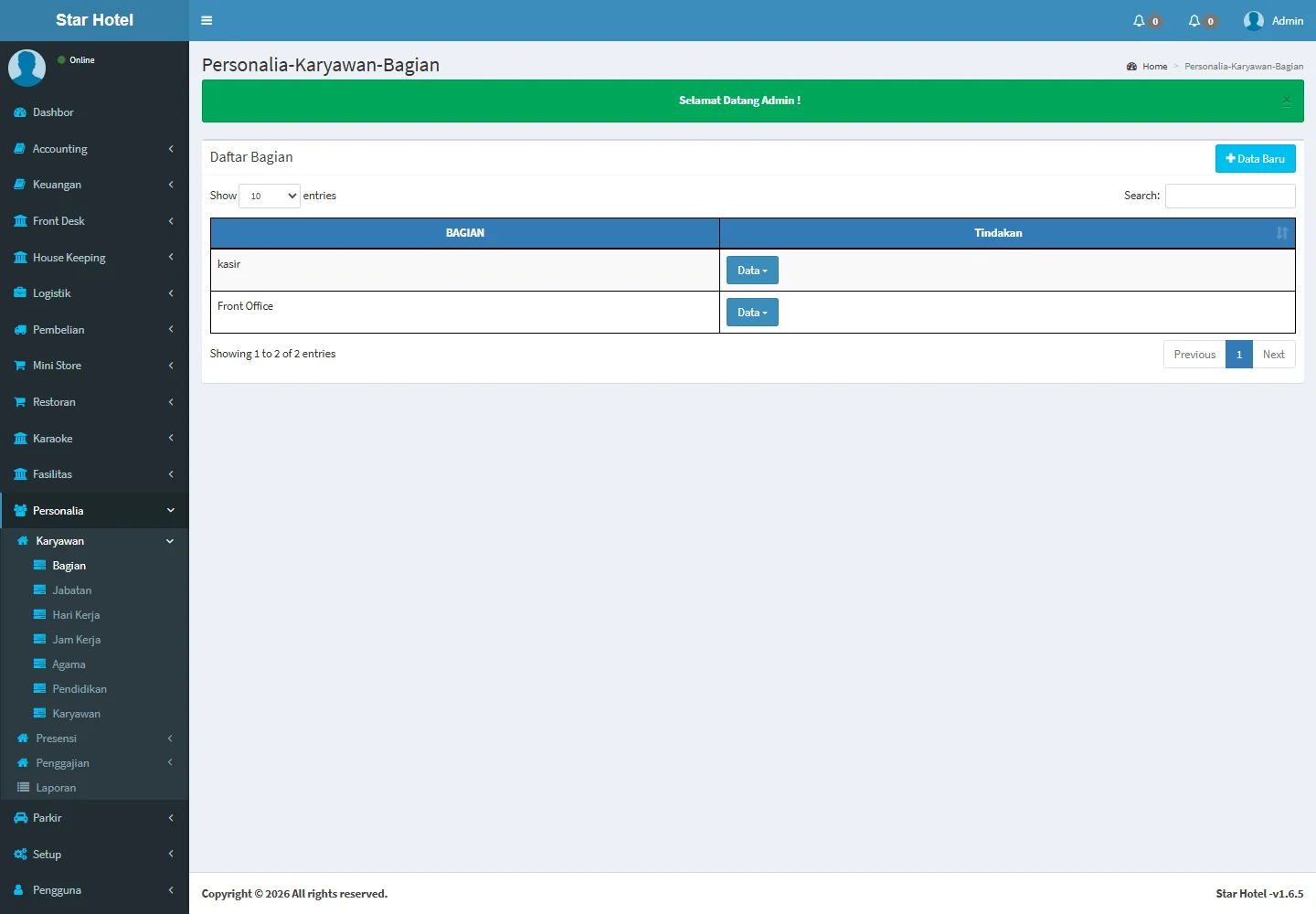 Kelola data bagian dan departemen dalam struktur organisasi hotel. Data ini menjadi dasar pengelompokan karyawan dan pembagian unit kerja.