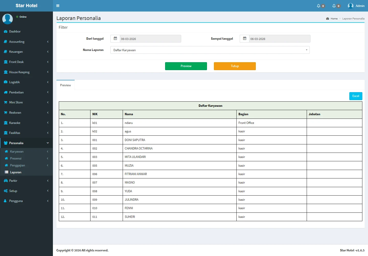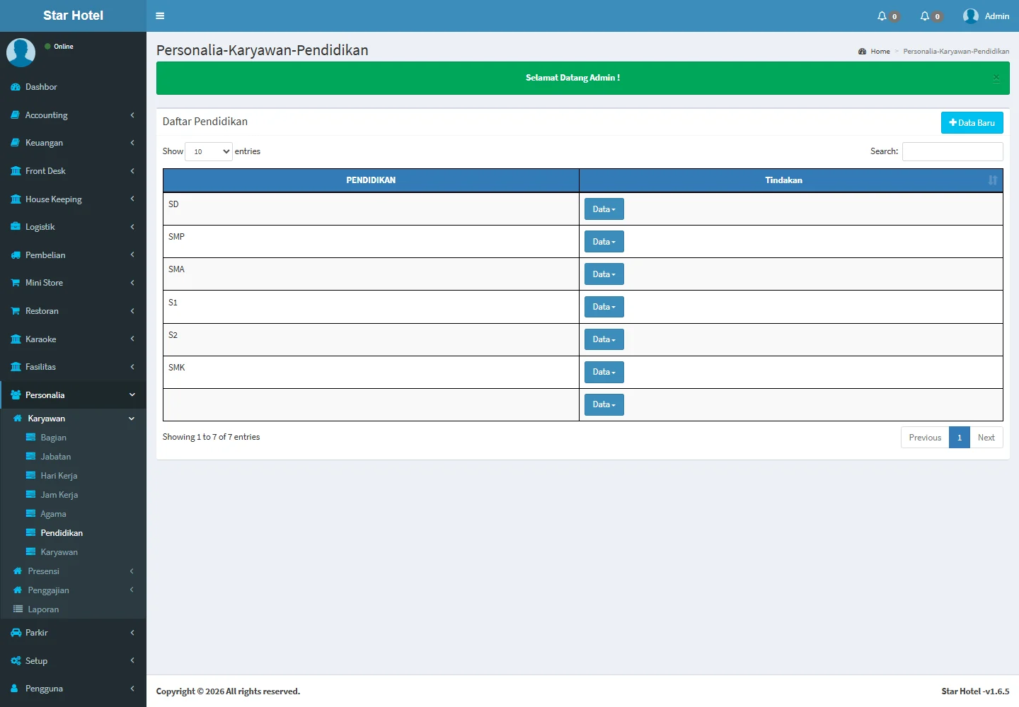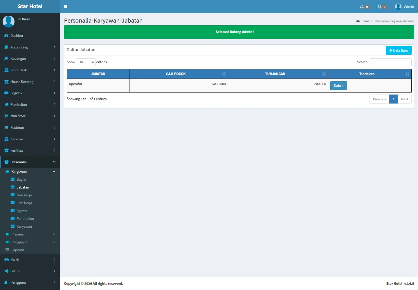 Manajemen data posisi atau jabatan dalam organisasi hotel. Digunakan untuk menentukan struktur kerja, tanggung jawab, serta pengaturan hak akses sistem.