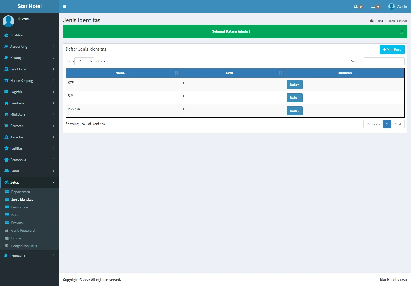 Daftarkan tipe dokumen identitas yang diterima: KTP, Paspor, SIM, dll. Standarisasi data identitas tamu untuk proses check-in yang akurat.