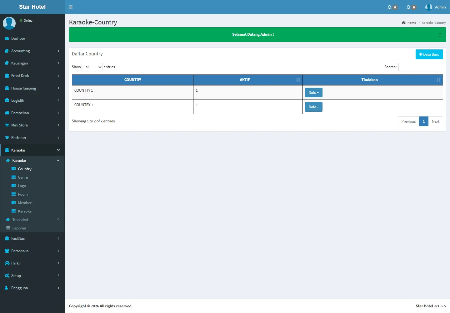 Kelola database lagu karaoke: judul lagu, artis, country, genre, serta kode lagu. Admin dapat menambah, mengubah, atau menghapus data lagu dengan mudah.