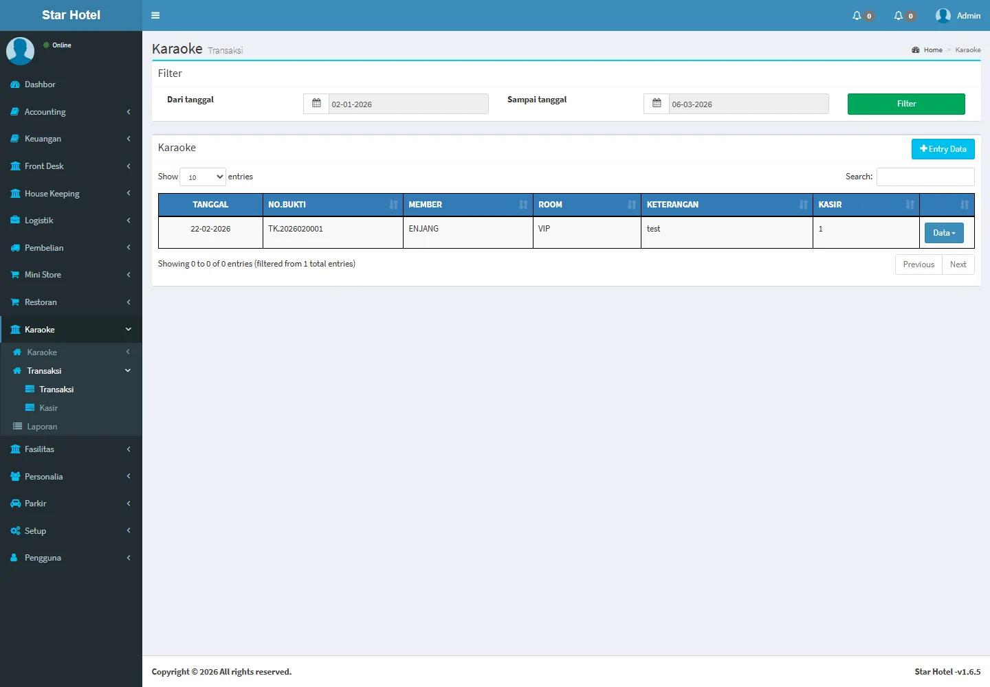 Kelola data transaksi karaoke yang mencakup penggunaan room, makanan, minuman, dan layanan tambahan yang digunakan selama sesi karaoke.