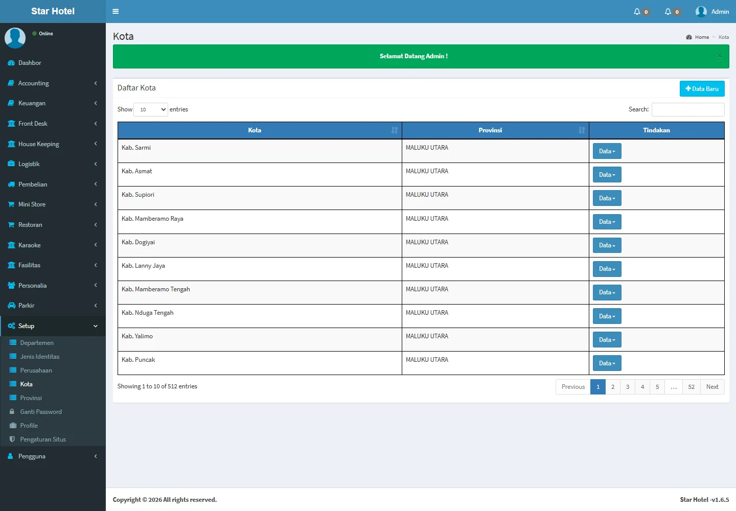Kelola master data kota yang digunakan dalam pengisian alamat tamu, supplier, maupun data perusahaan.