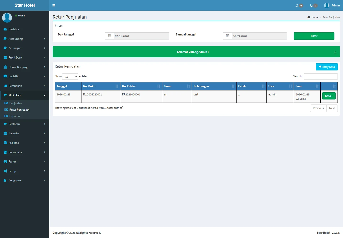 Kelola toko atau minimarket hotel dengan mudah. Dari penjualan eceran, retur, hingga laporan penjualan yang komprehensif untuk optimasi pendapatan retail.
