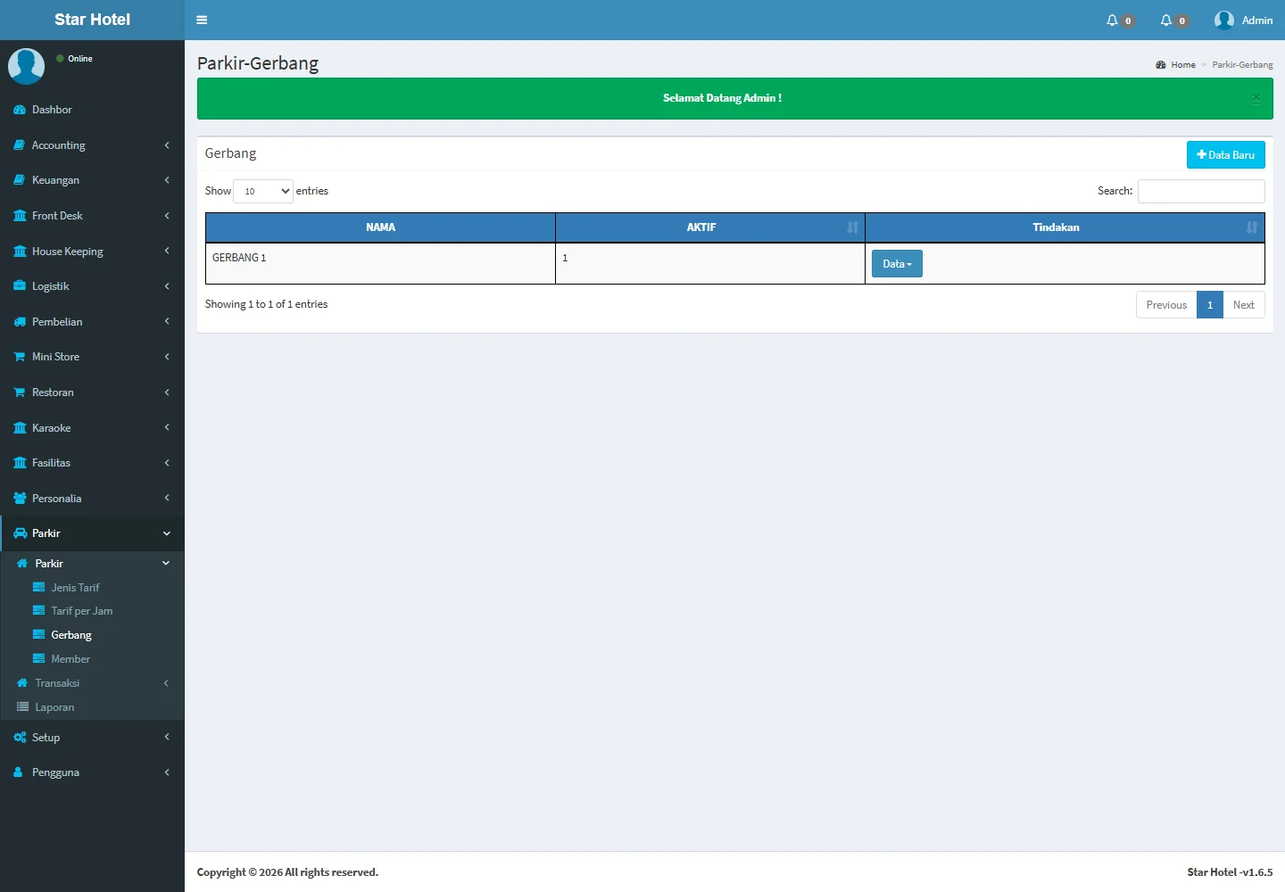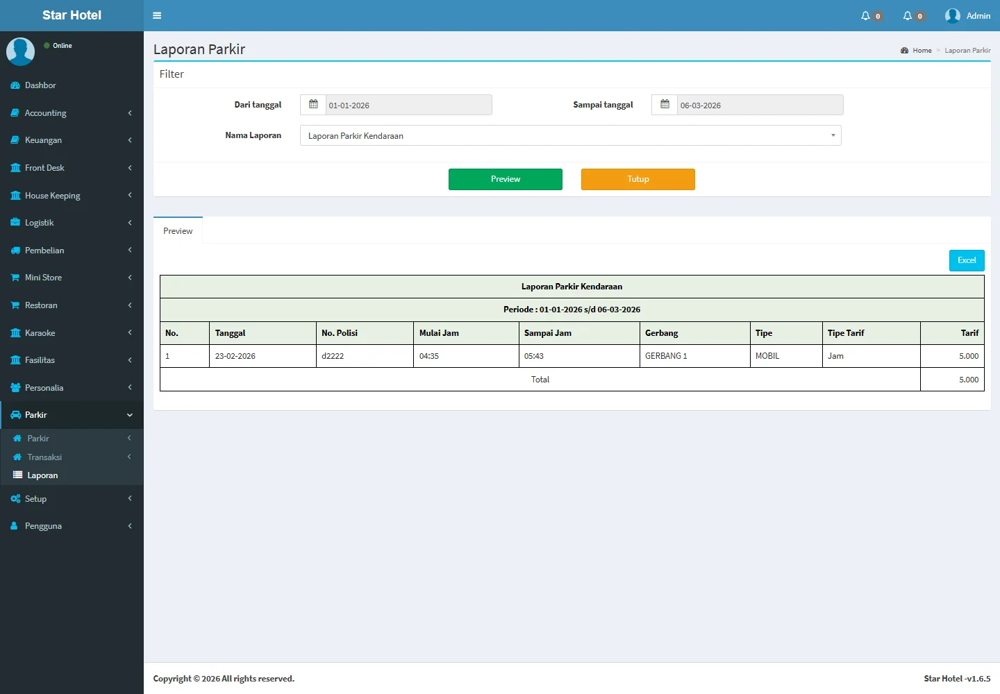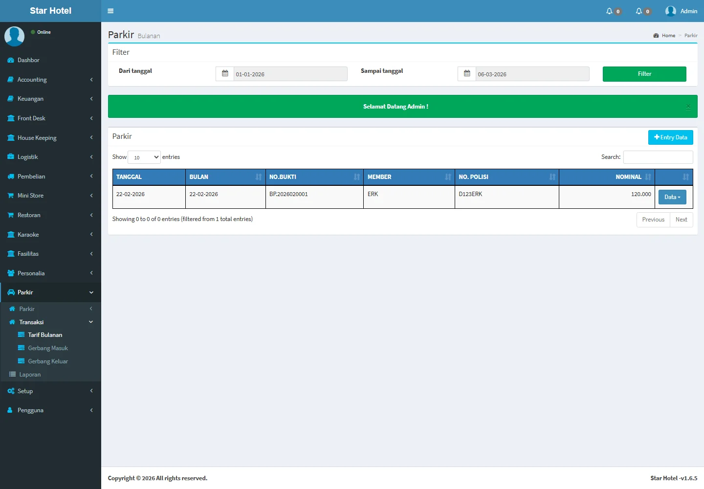 Sistem manajemen parkir hotel yang terintegrasi. Kelola tarif, gerbang masuk-keluar, member bulanan, dan laporan pendapatan parkir secara otomatis.