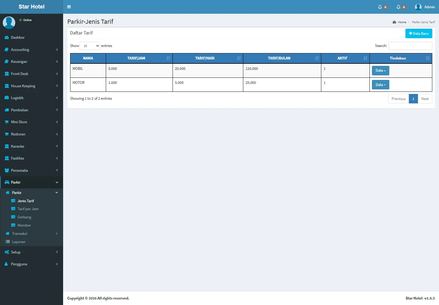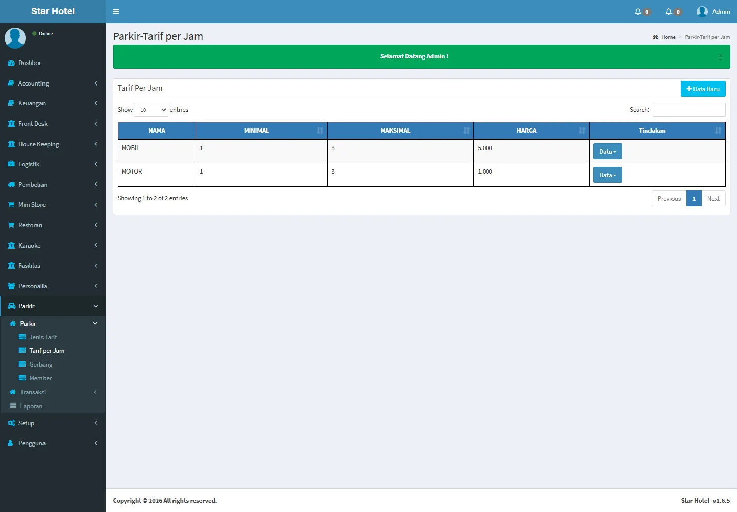 Manajemen data tarif parkir berdasarkan durasi penggunaan. Admin dapat mengatur tarif jam pertama, jam berikutnya, serta batas tarif maksimal harian.