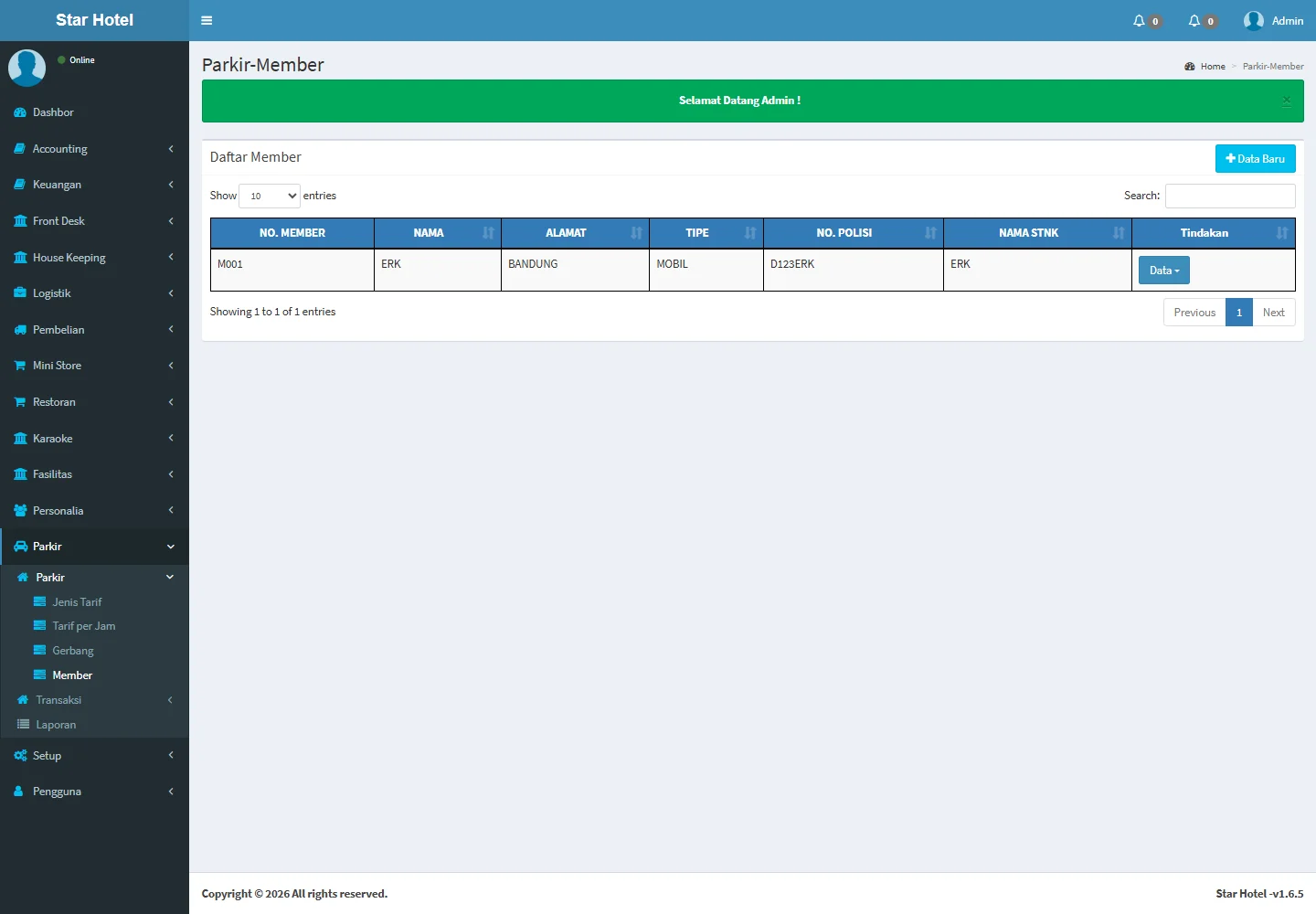 Manajemen data member parkir untuk pelanggan atau karyawan yang menggunakan fasilitas parkir secara berlangganan.