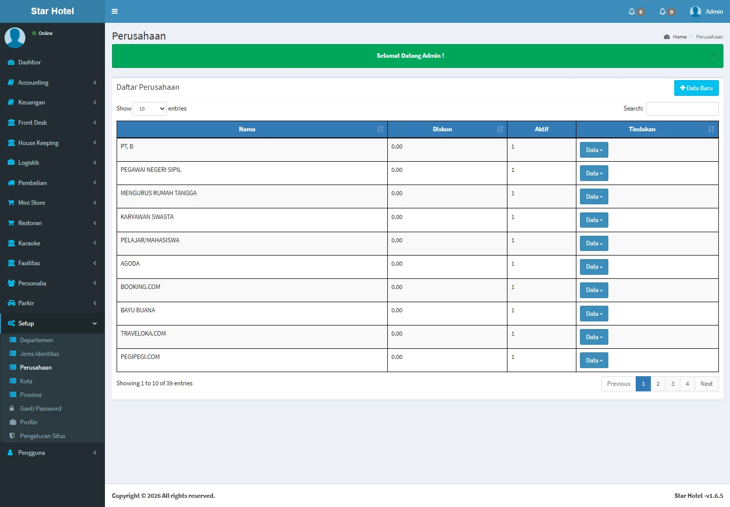 Kelola data perusahaan dalam sistem melalui tabel manajemen data. Admin dapat menambah, mengubah, mengaktifkan, atau menonaktifkan data perusahaan yang terdaftar.