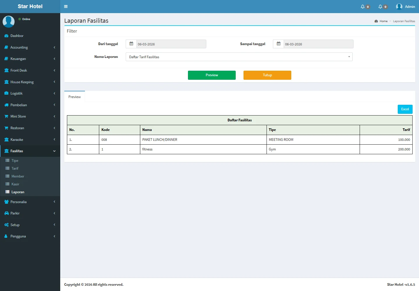 Kelola semua fasilitas tambahan hotel: kolam renang, gym, spa, dan lainnya. Atur tarif, member, kasir, dan laporan pendapatan fasilitas secara terpadu.