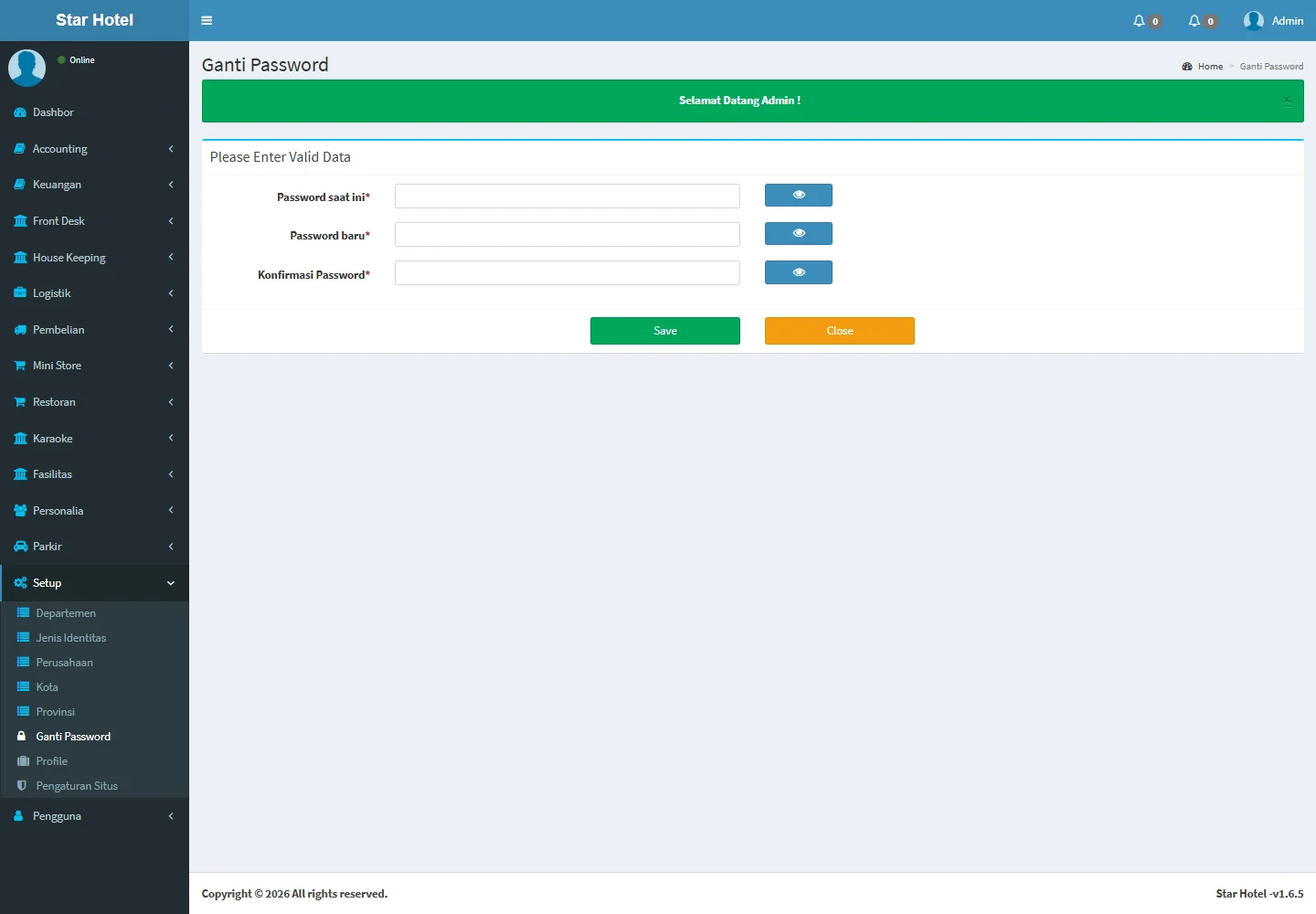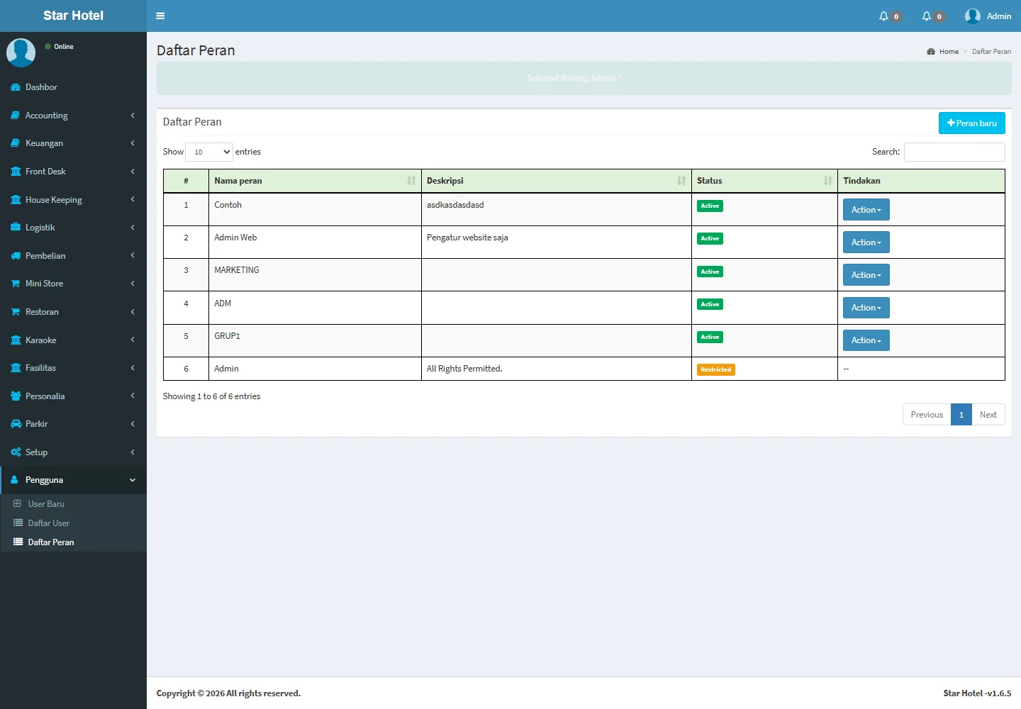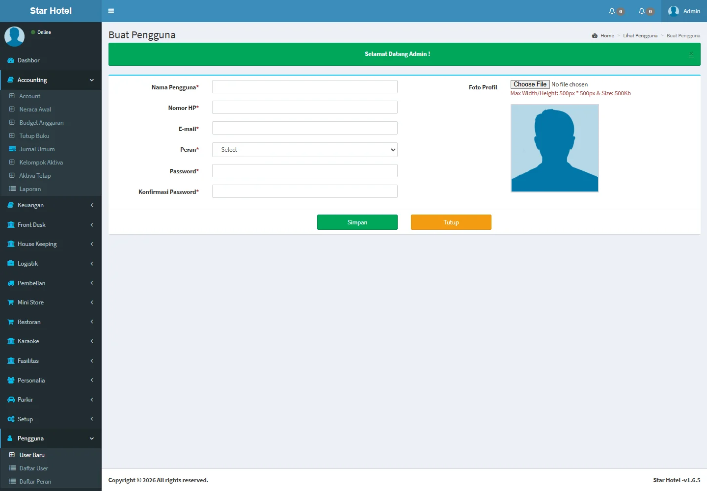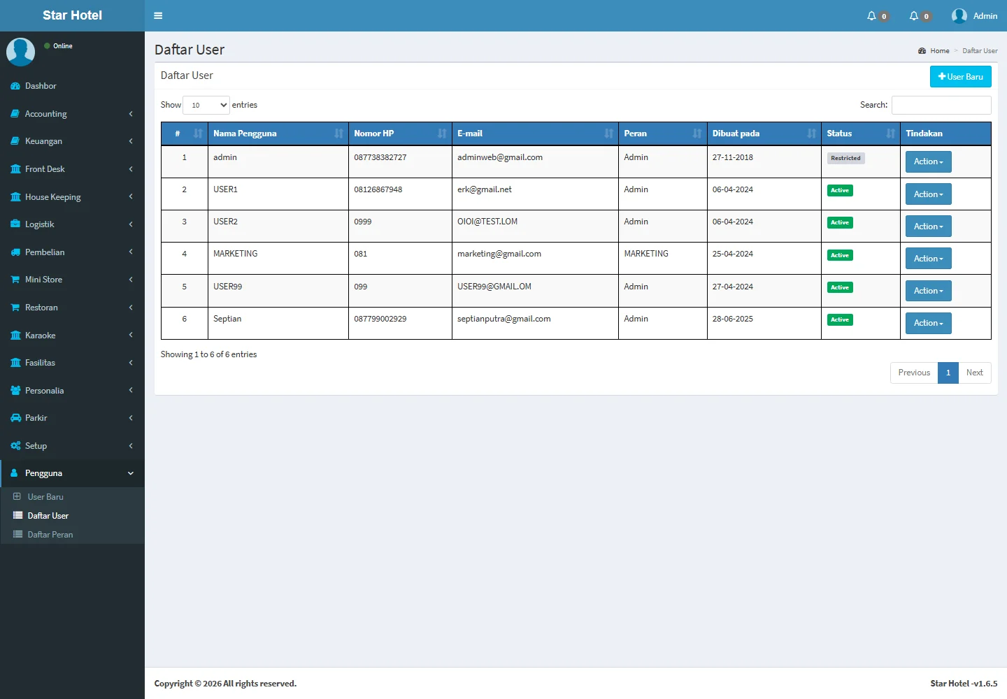 Manajemen akses sistem yang aman dan terkontrol. Buat user baru, atur peran dan hak akses per modul, dan pantau seluruh pengguna aktif sistem hotel.