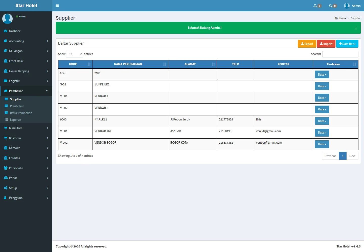 Database lengkap vendor dan supplier hotel. Catat kontak, syarat pembayaran, produk unggulan, dan evaluasi performa setiap supplier.